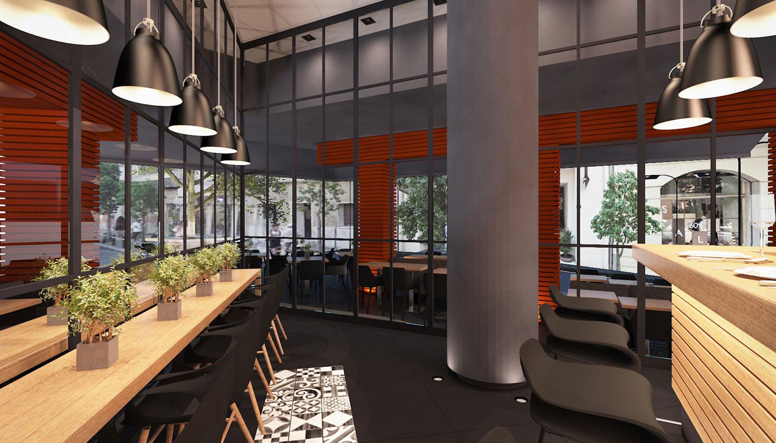 Το καλοκαίρι του 2015, ανακαινίσαμε ένα λιλιπούτειο cafe/bar/εστιατόριο με τριγωνική κάτοψη, στη γωνία των οδών Κανάρη και Μηλιώνη στο Κολωνάκι. Δεδομένου ότι ήταν ήδη δημοφιλές στέκι επωνύμων, έπρεπε με την ανακαίνιση να καλυφθούν τόσο οι υψηλές απαιτήσεις του ιδιοκτήτη, όσο και οι προσδοκίες των φίλων και πελατών του. Ένα από τα κύρια στοιχεία της επέμβασης, είναι η επένδυση των κολονών και των δοκών της όψης με πορτοκαλί αλουμινένιες δοκίδες, με στόχο να ξεχωρίσει το μικροσκοπικό κατάστημα από τις πολλές γειτονικές του επιχειρήσεις.