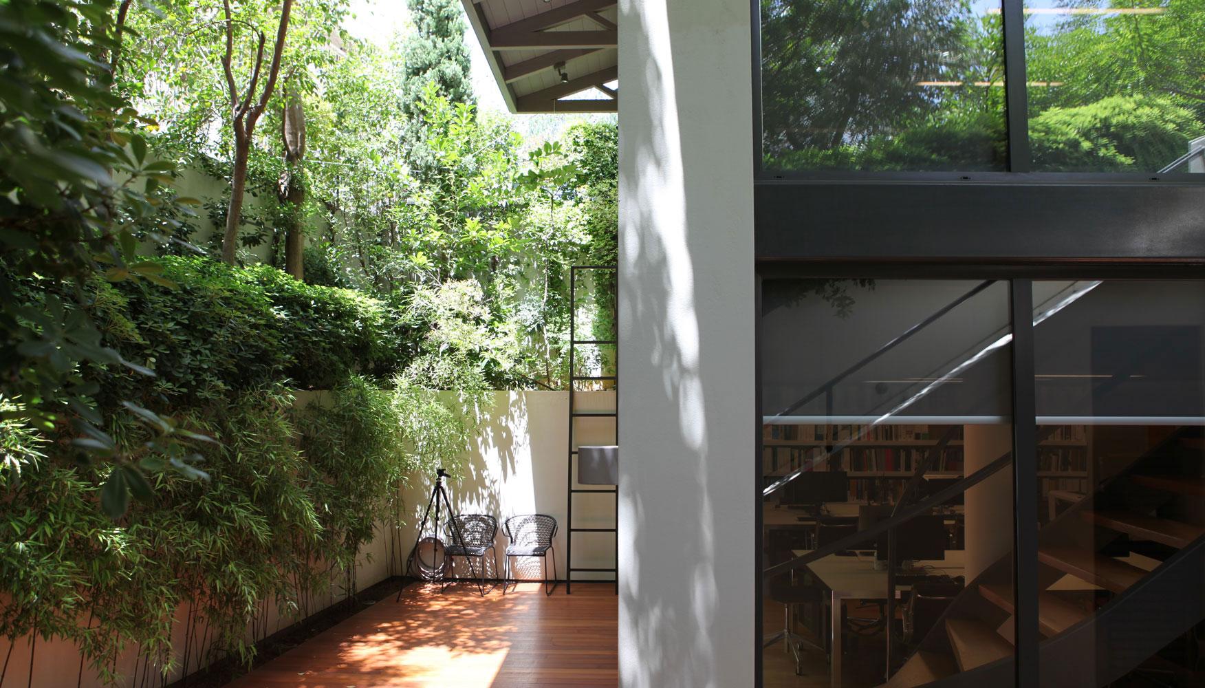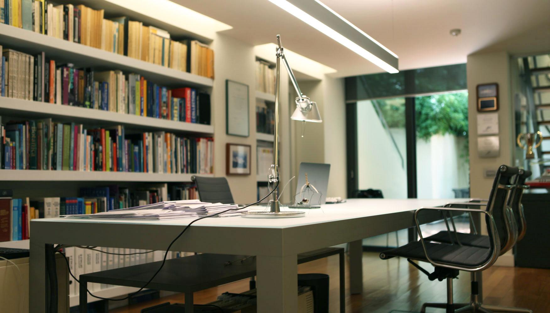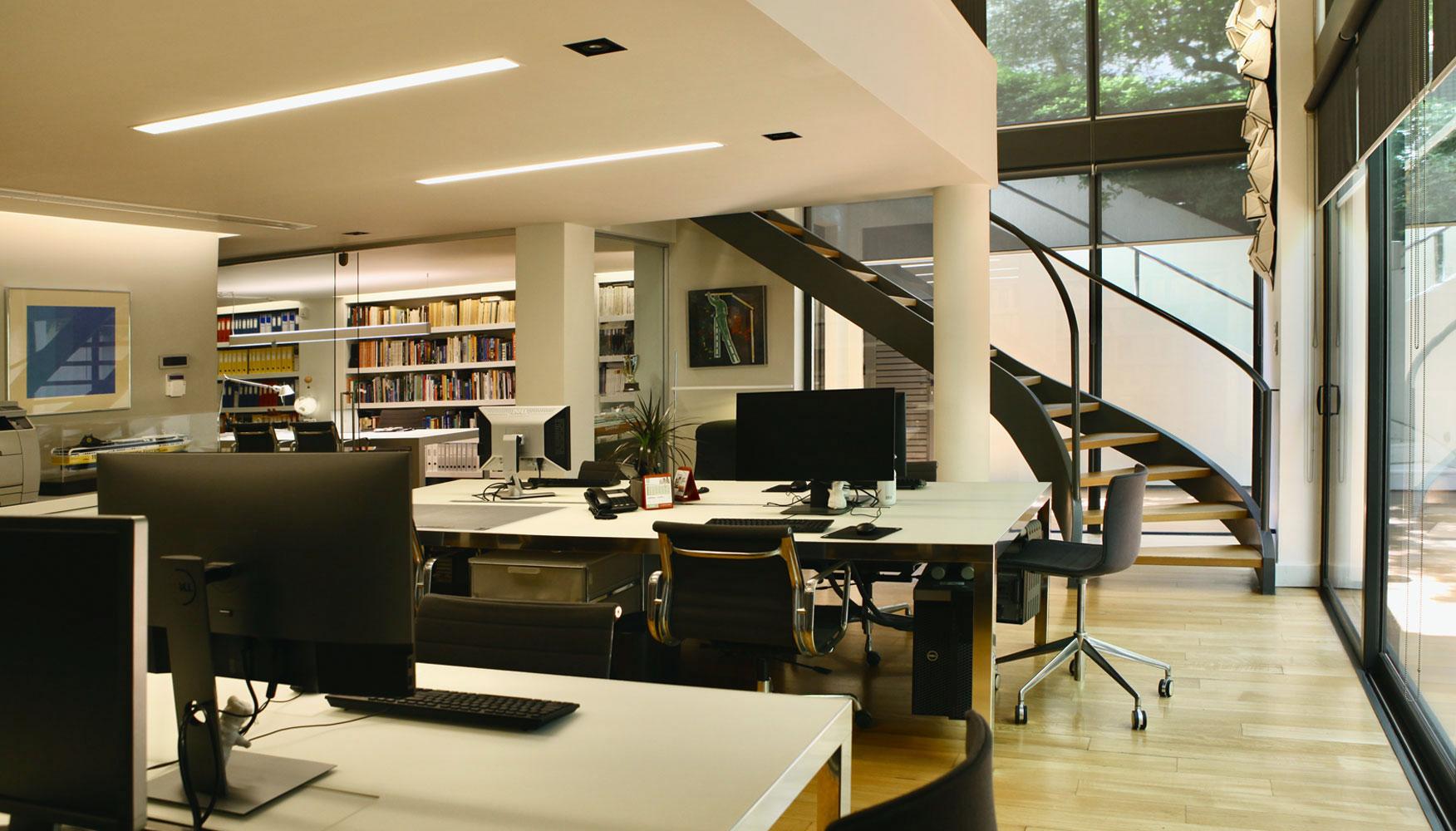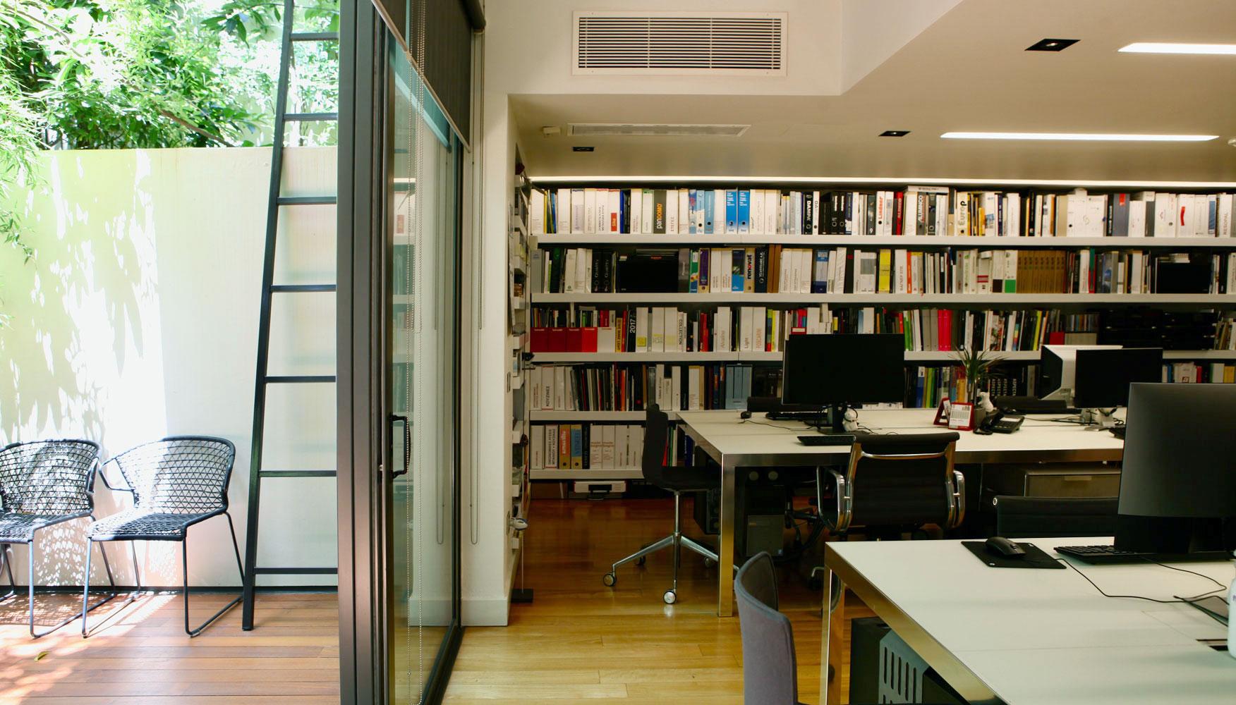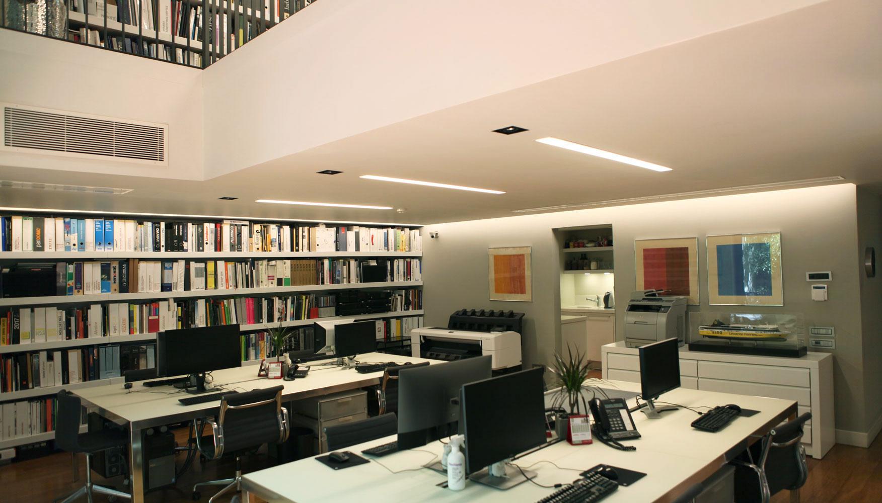 To 2007, έχοντας τη δεκαετή εμπειρία του πρώτου μας γραφείου και γνωρίζοντας επακριβώς τις ανάγκες και τα θέλω μας, σχεδιάσαμε τα νέα μας γραφεία, όπως ακριβώς τα φανταζόμασταν. Το κτίριο βρίσκεται στο κέντρο ενός μεγάλου κήπου, του οποίου την εικόνα απολαμβάνουμε καθημερινά μέσα από τεράστια γυάλινα ανοίγματα. Το γραφείο είναι εξοπλισμένο με ένα εκτεταμένο σύστημα ραφιών, όπου βρίσκονται απόλυτα αρχειοθετημένα τα δείγματα υλικών, τα εργαλεία μας, τα βιβλία και οι κατάλογοι μας. Η ψυχή του γραφείου μας, όμως, είναι οι μεγάλες νησίδες εργασίας και δημιουργικότητας που βρίσκονται στο κέντρο του.