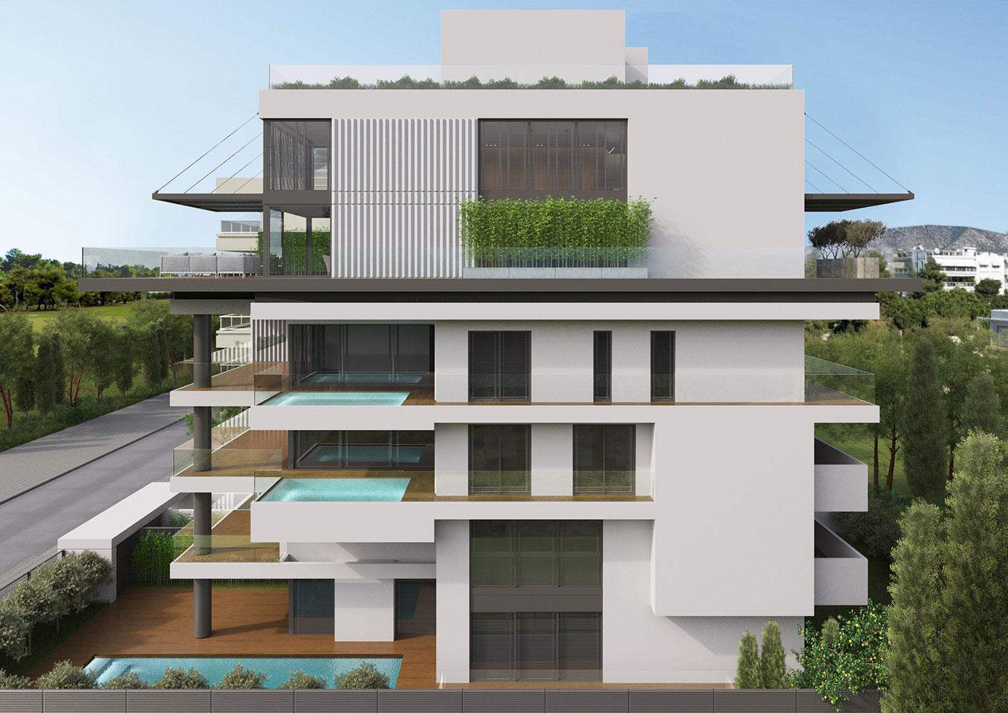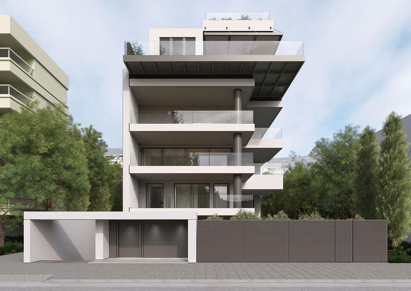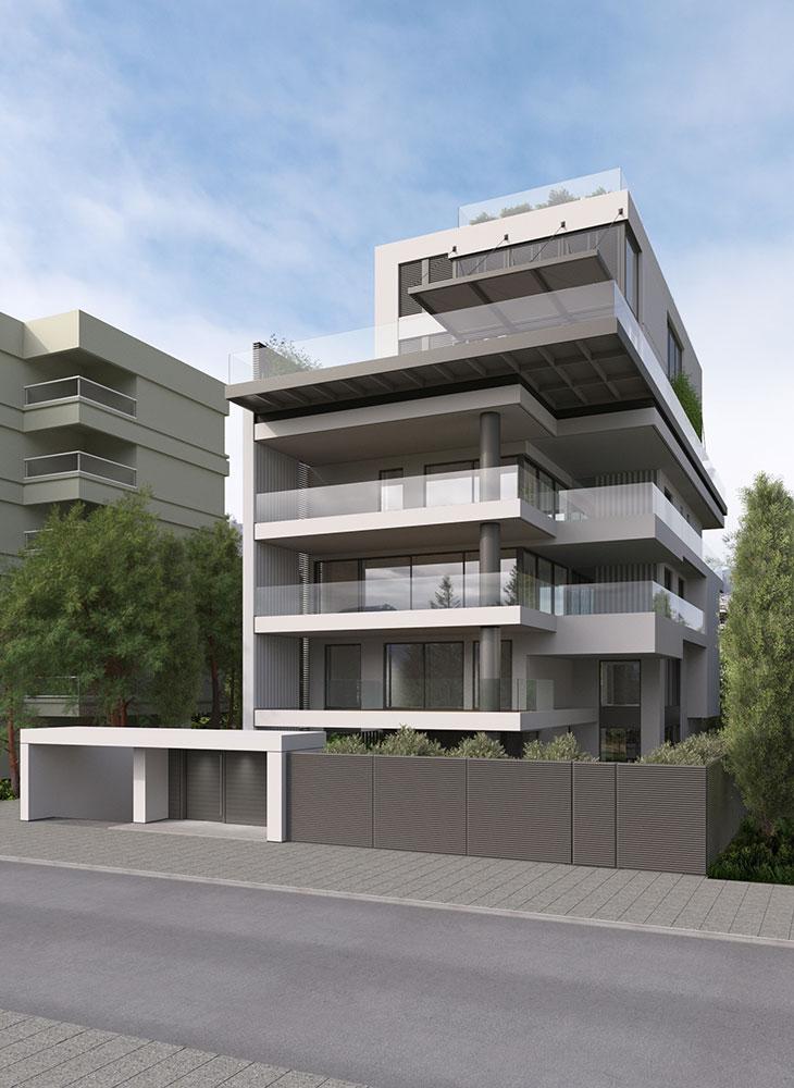 Το κτίριο που σχεδιάσαμε αποτελείται από μια ισόγεια μεζονέτα, ένα οροφοδιαμέρισμα και τη μεζονέτα της ιδιοκτήτριας, με μοναδική θέα στο Golf της Γλυφάδας και τη θάλασσα.