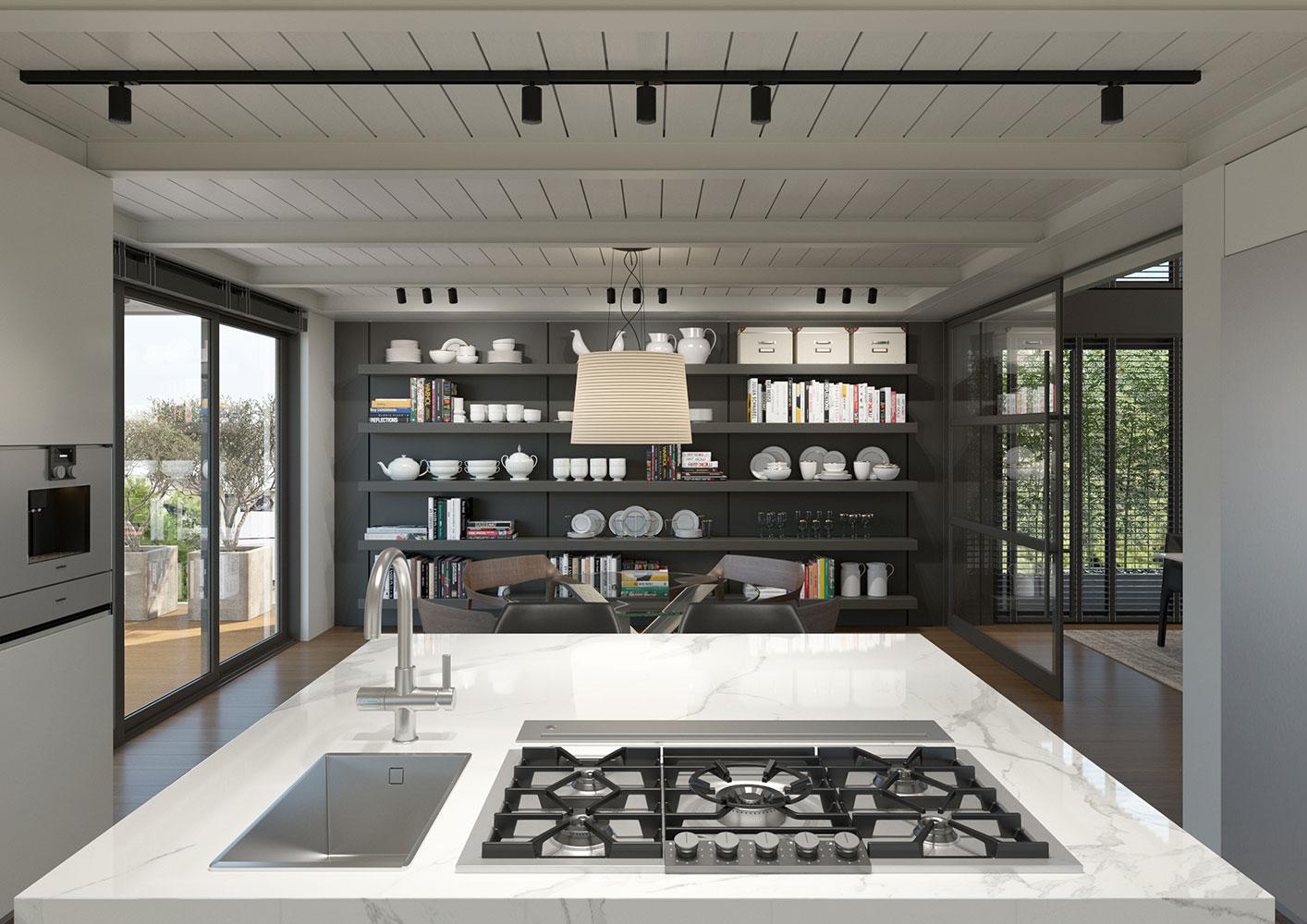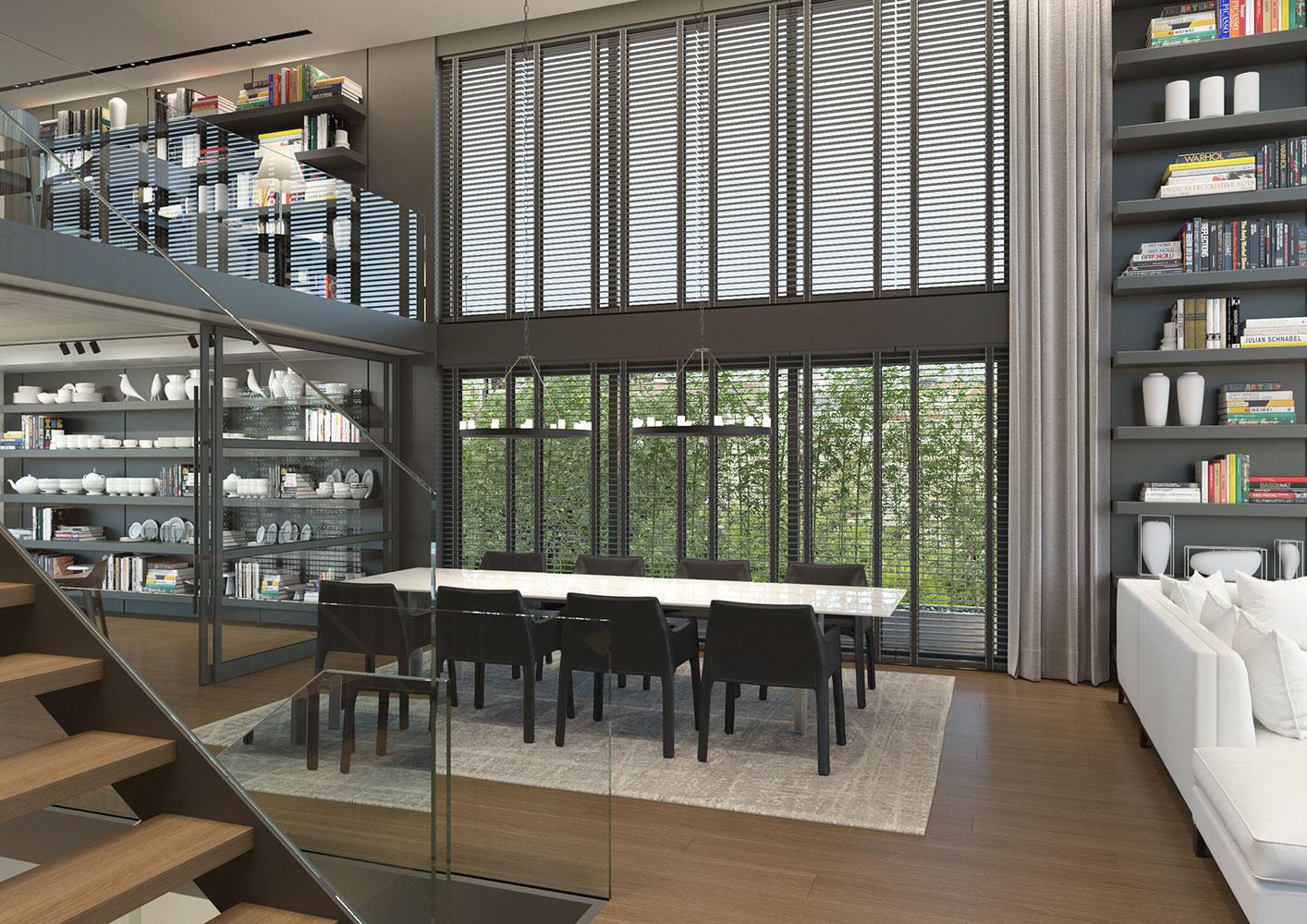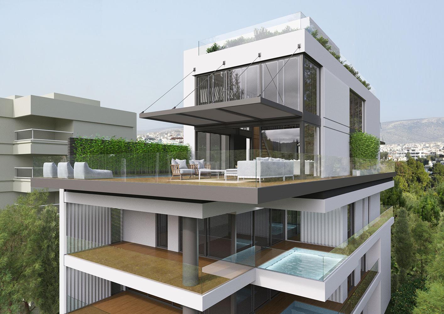Η ιδιοκτήτρια του οικοπέδου μας ζήτησε να σχεδιάσουμε ένα κτίριο κατοικιών, τους τελευταίους ορόφους του οποίου θα καταλάμβανε μια μεζονέτα με πισίνα για δική της χρήση.