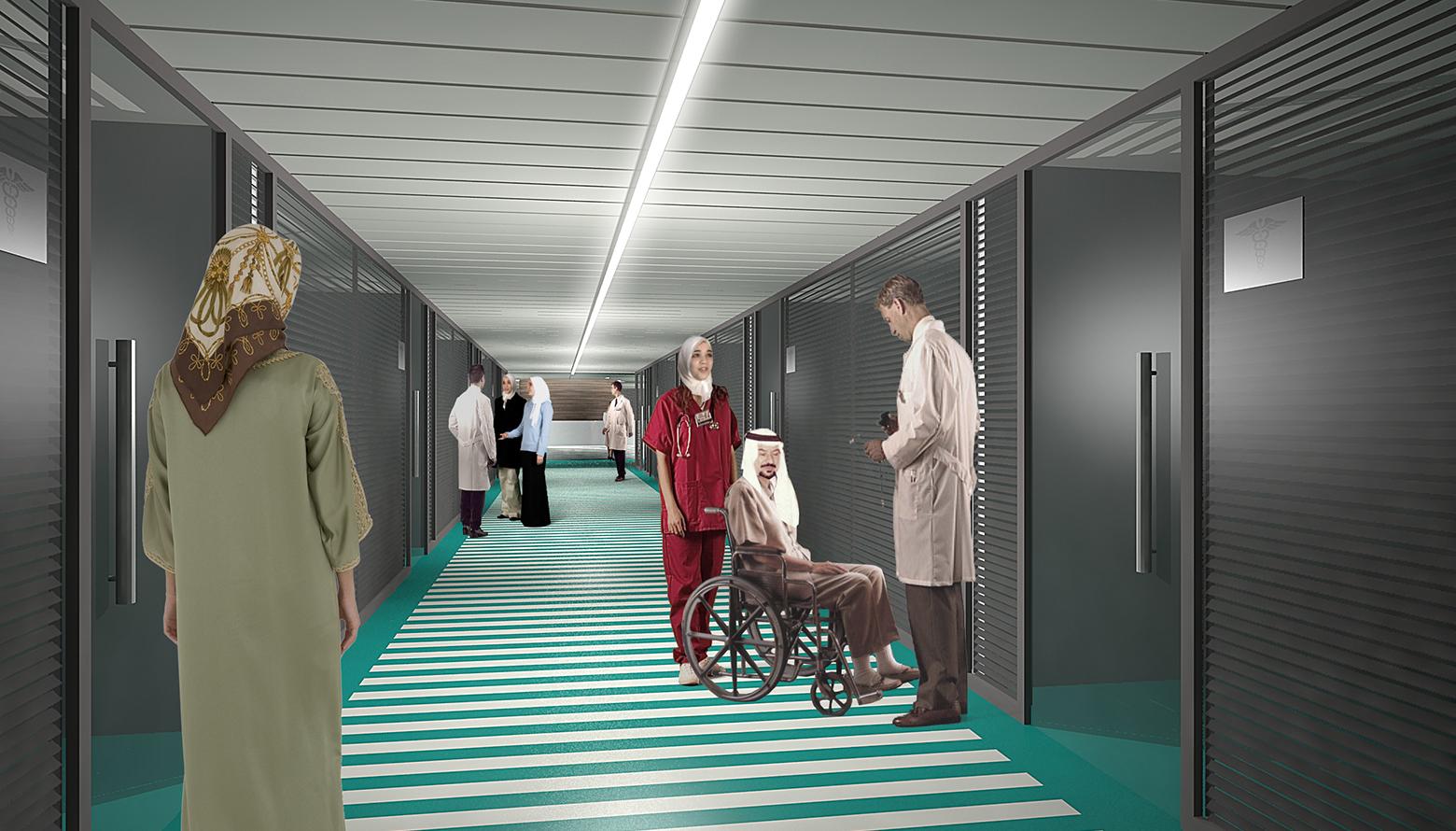 Ακολουθώντας το πολύ αυστηρό κτιριολογικό πρόγραμμα, σχεδιάσαμε κλινικές, χειρουργεία, θαλάμους ασθενών, καθώς και κοινόχρηστους χώρους, κλιμακοστάσια, και μια διπλή, παράλληλη είσοδο για επιβάτες και ασθενοφόρα.