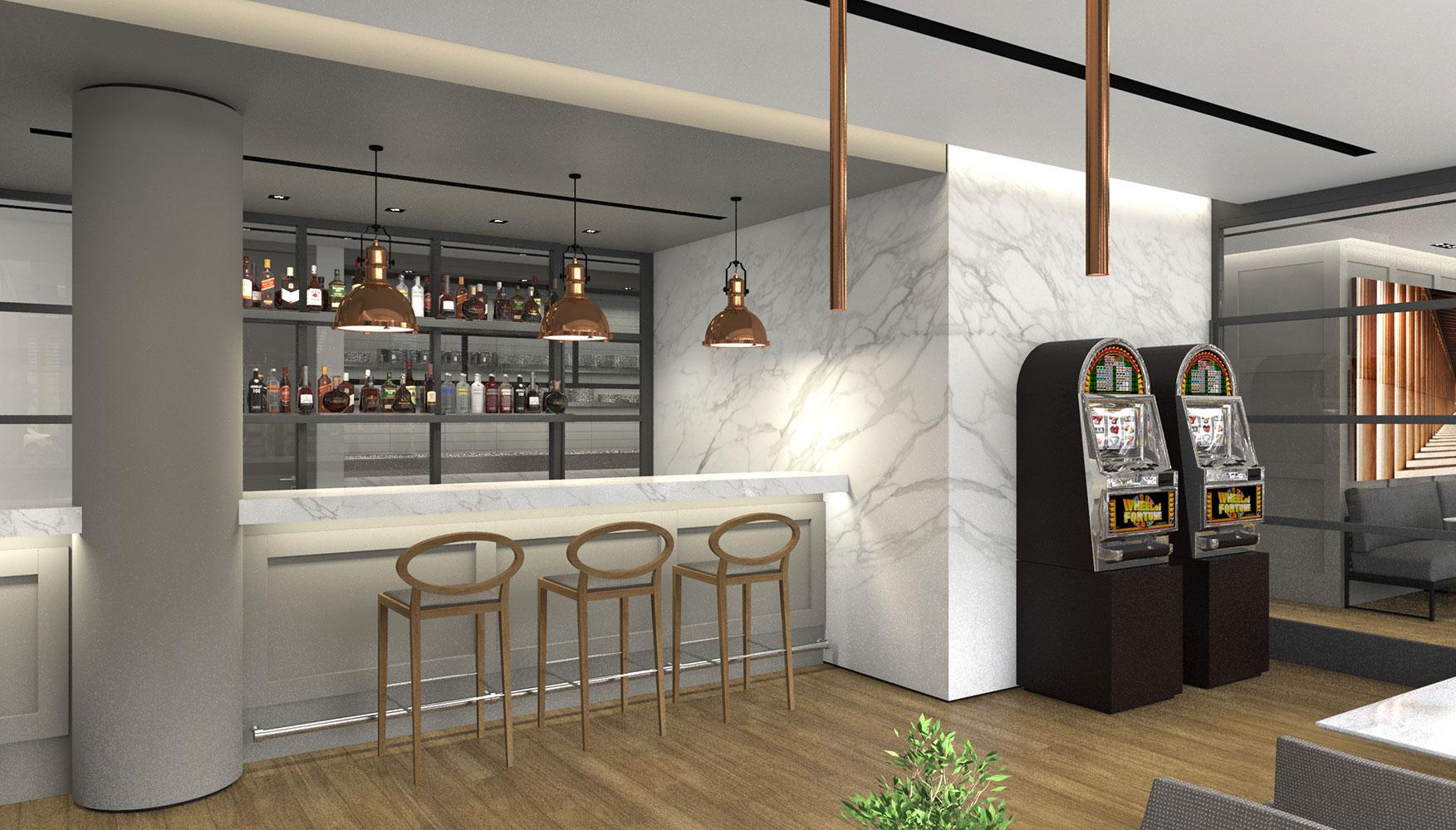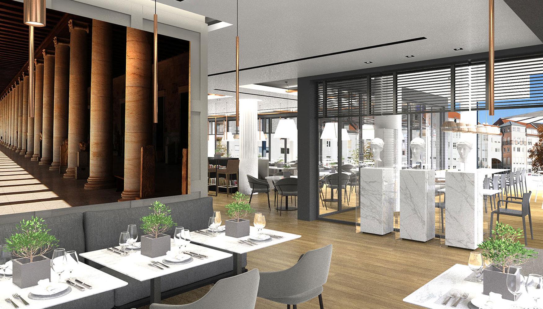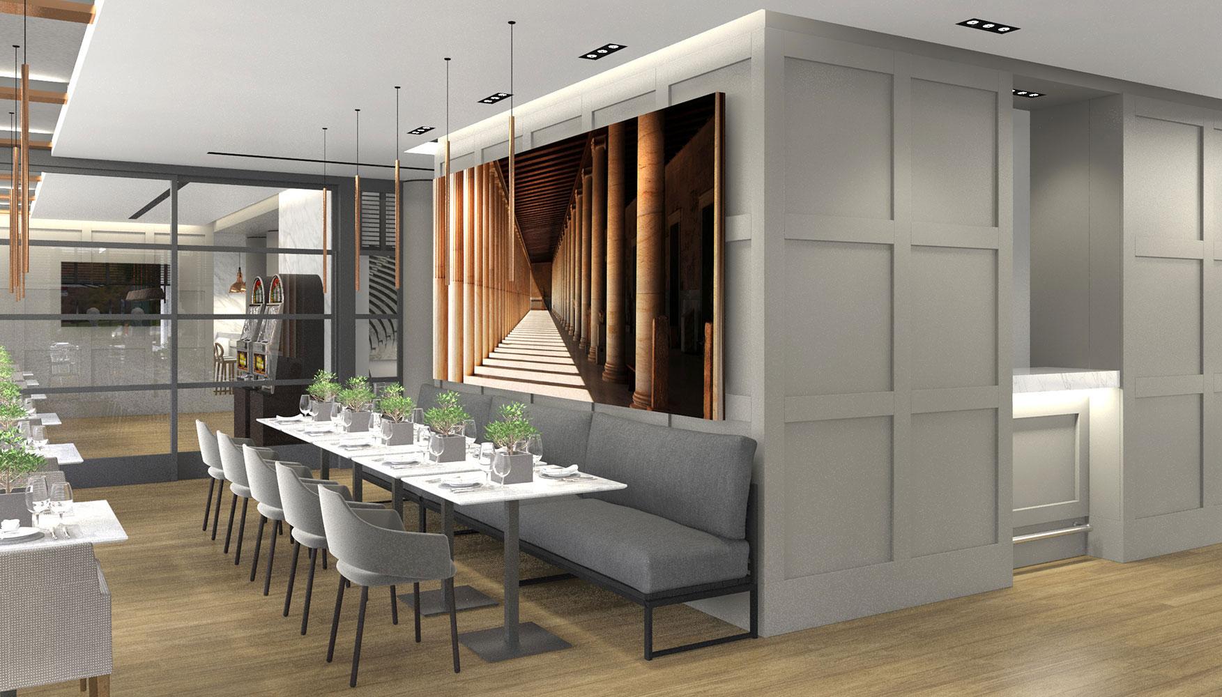In Frankfurt, Germany, we designed the renovation of a large ground-level space. The entrepreneurs, a group of friends and second-generation Greeks who live in Germany, asked for two separate entertainment spaces, an all-day café/bar/restaurant, with a Greek theme, and a smaller shisha bar with inspiration from the East. The larger area also functions as a live music event space, so there is a possibility to modify the whole layout, even to empty the space completely. For the shisha bar, our inspiration was the landscape of Wadi Rum desert.