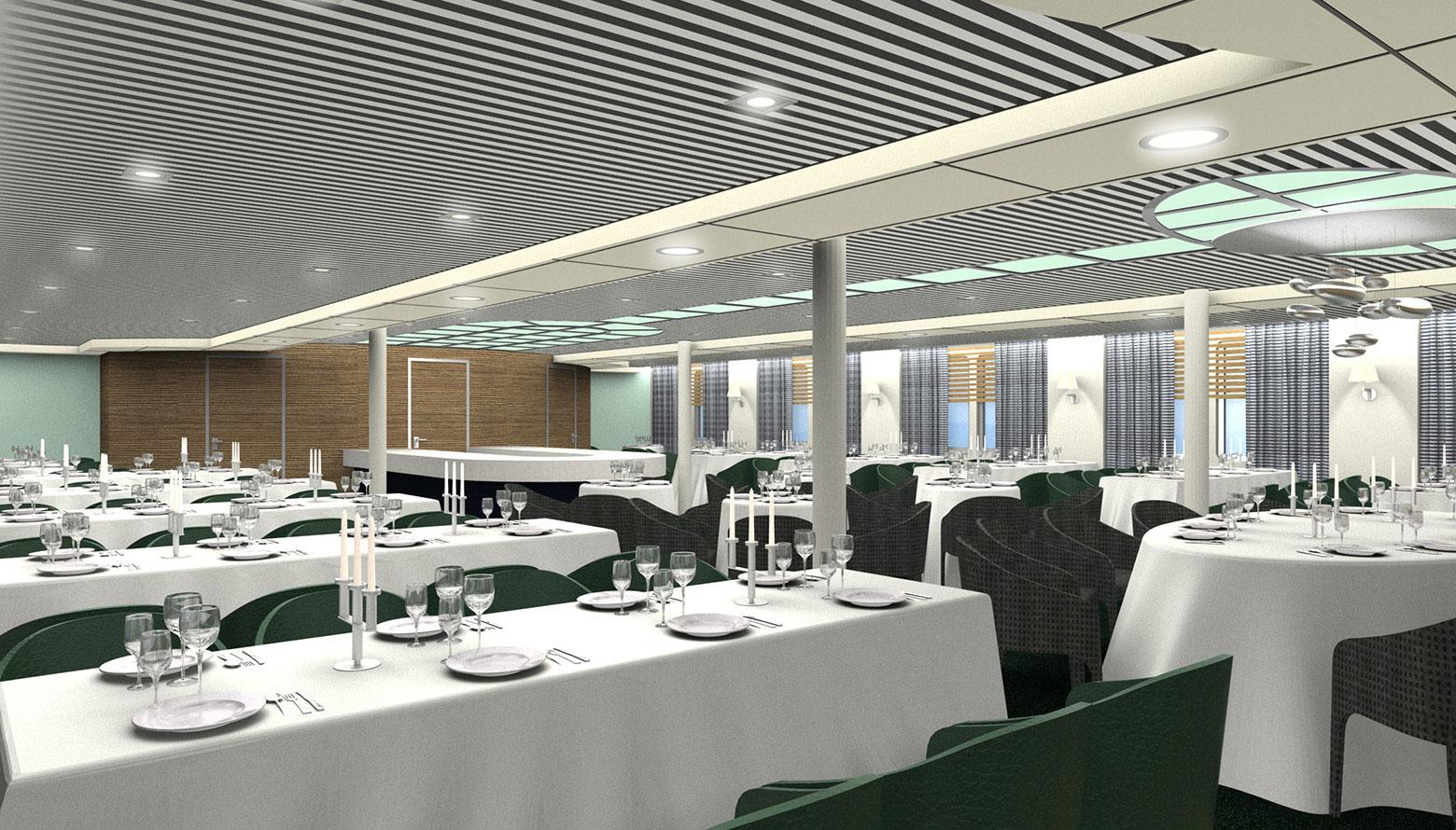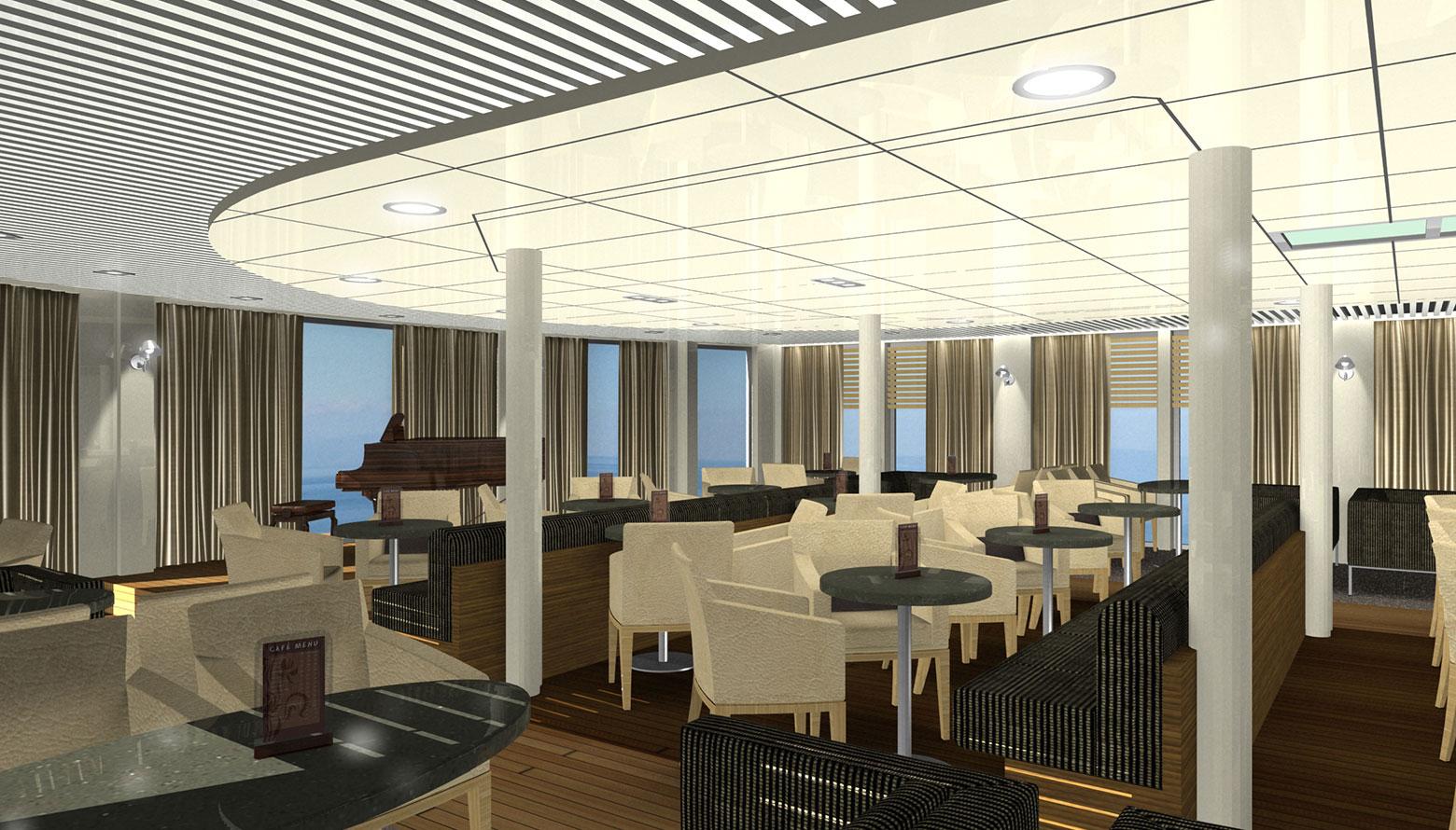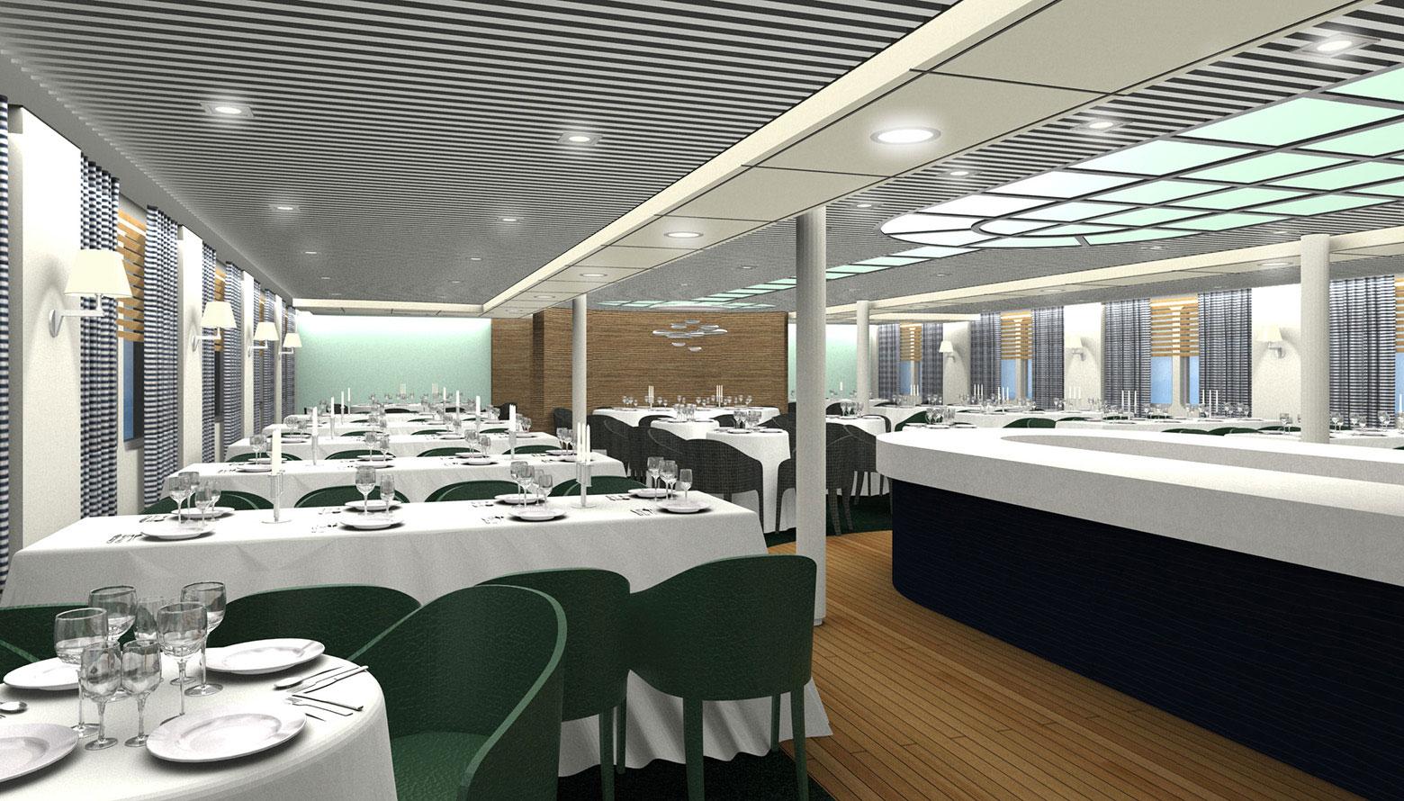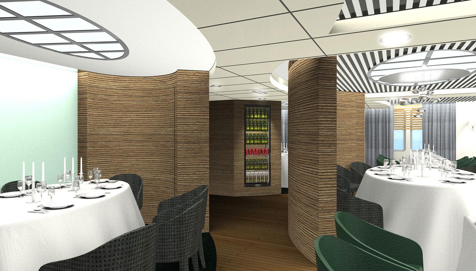 The design of Douro Azul river boat was a very interesting and original project. The vessel’s main characteristics were her narrow width, as well as the low heights of the interiors. Our proposal revolved around these specific features: smart tricks were used in order to create a sense of height, without resorting to the obvious solution of mirrored ceilings. Two levels of light-colored ceilings with custom concealed lighting, were used instead. Moreover, the smart design of the general arrangement resulted in the overall impression of a much wider ship.