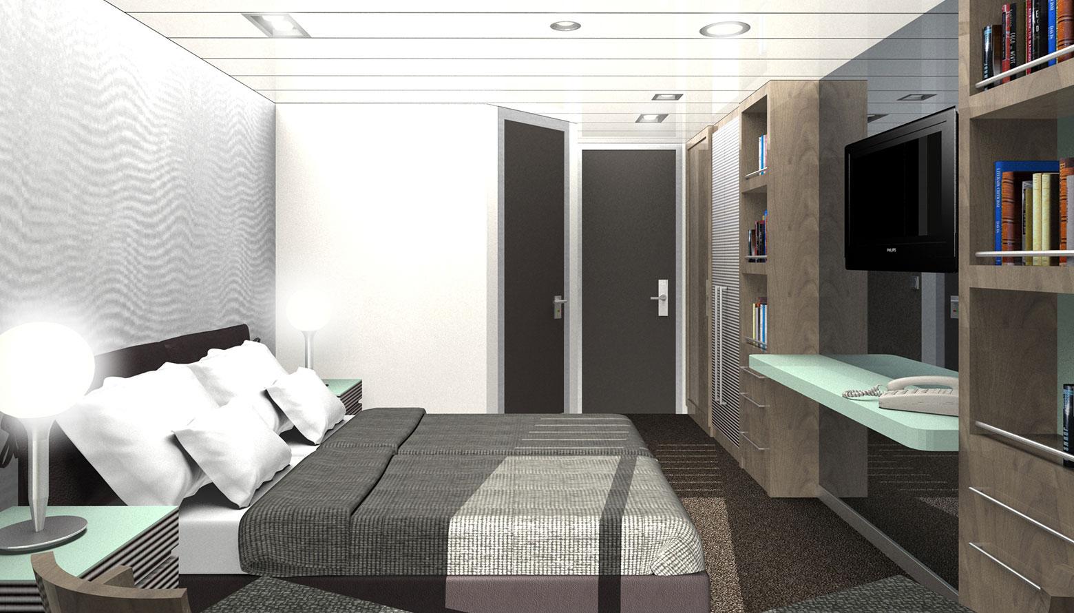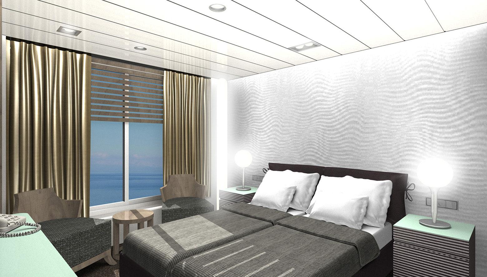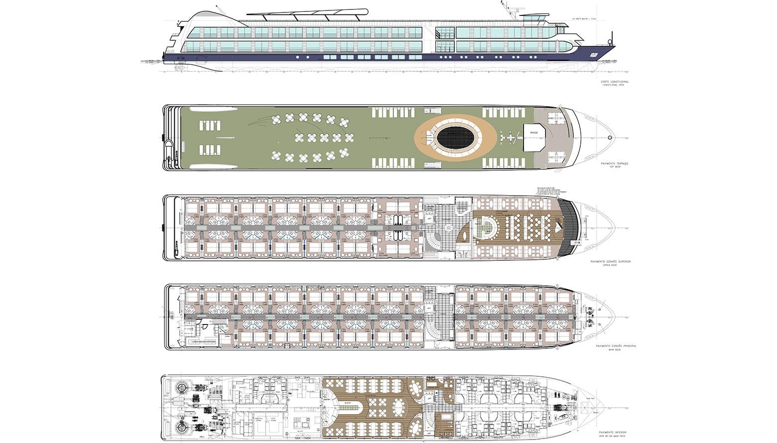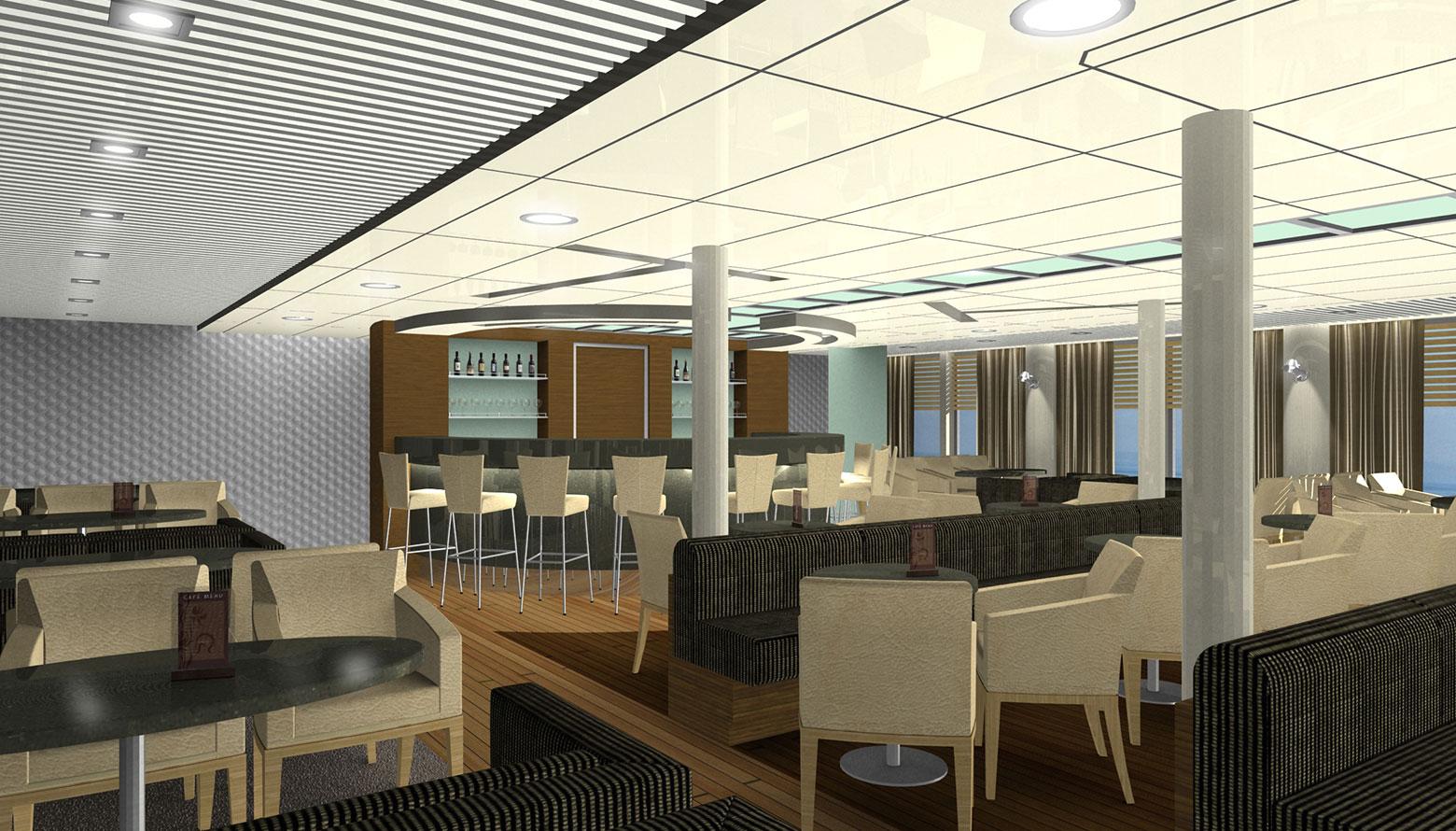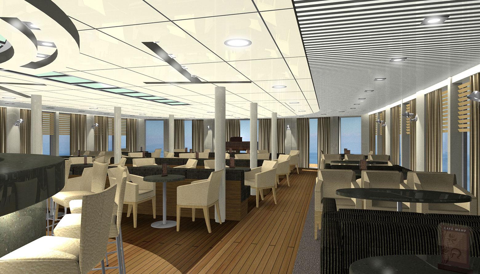 The design of Douro Azul river boat was a very interesting and original project. The vessel’s main characteristics were her narrow width, as well as the low heights of the interiors. Our proposal revolved around these specific features: smart tricks were used in order to create a sense of height, without resorting to the obvious solution of mirrored ceilings. Two levels of light-colored ceilings with custom concealed lighting, were used instead. Moreover, the smart design of the general arrangement resulted in the overall impression of a much wider ship.