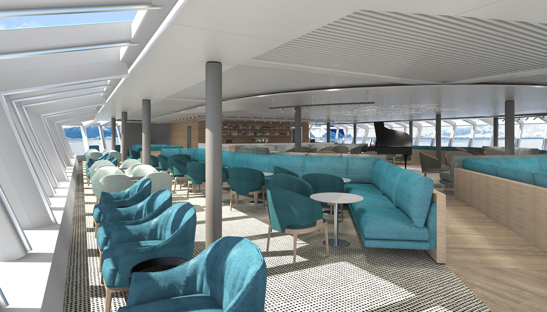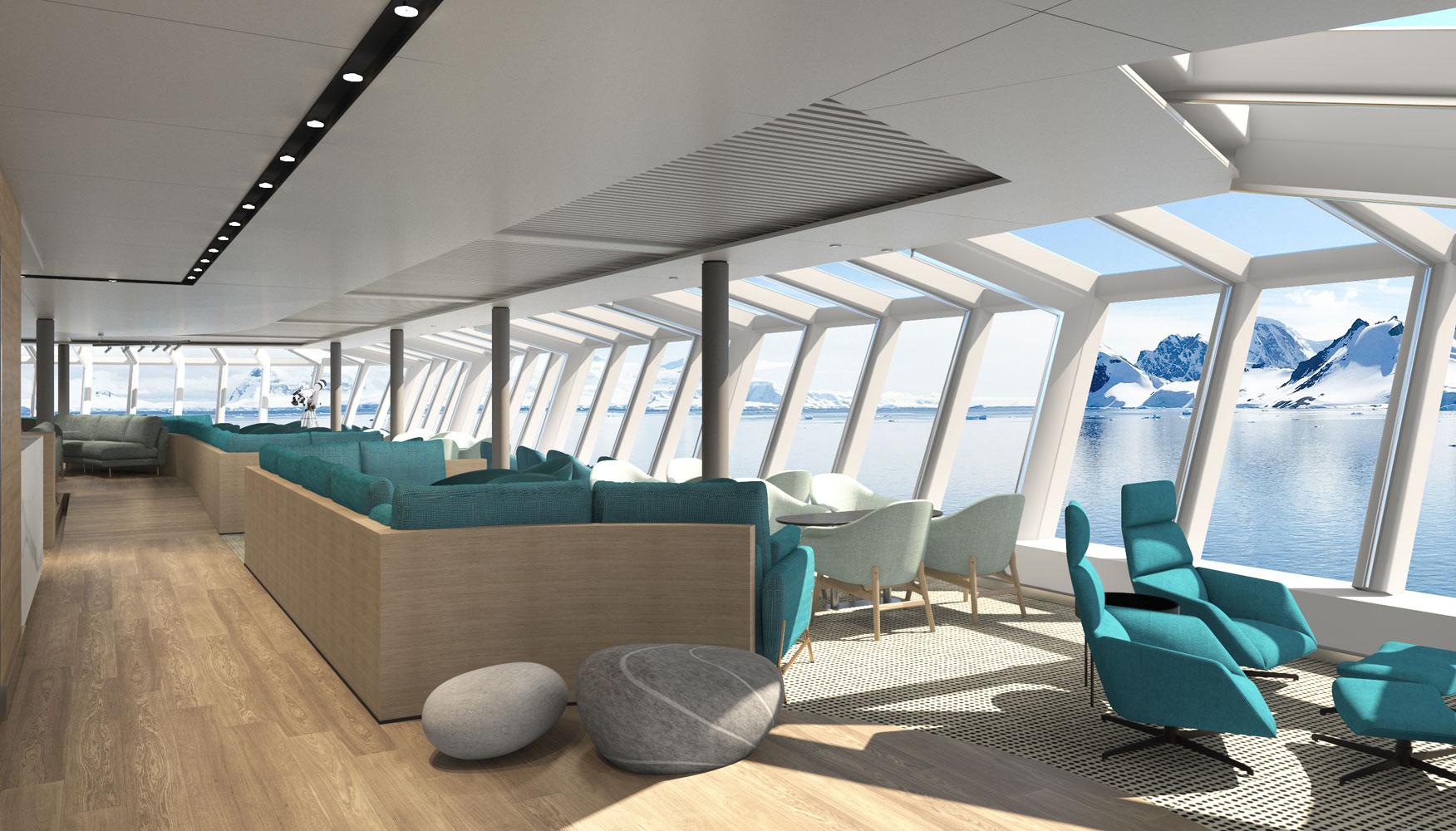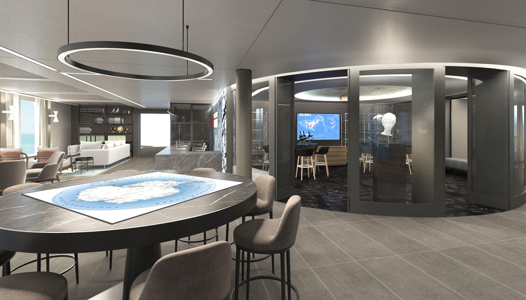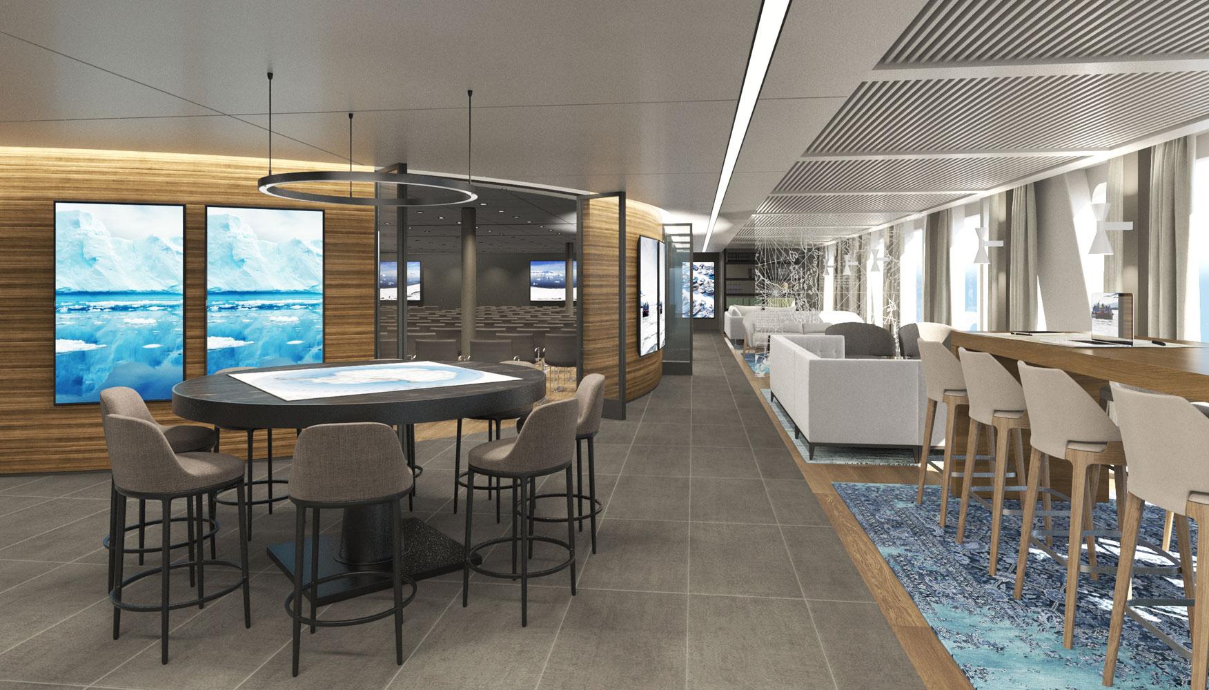 Moreover, we were asked to design seminar areas for the expeditions and a laboratory, where the passengers/explorers could bring and study their findings from their expeditions. Τhe interior layouts were arranged so that they could take the most advantage of the beautiful polar landscape views.