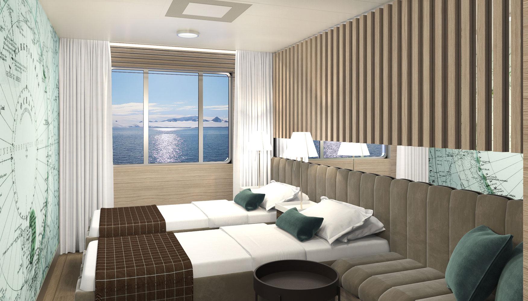 We were asked to redesign the public areas, as well as all categories of cabins. Τhe cabins had to be especially comfortable because of the long duration of the cruises. They should also have a lot of storage space for the personal items of guests, as well as the specialized equipment that the company provides to them for their expeditions.