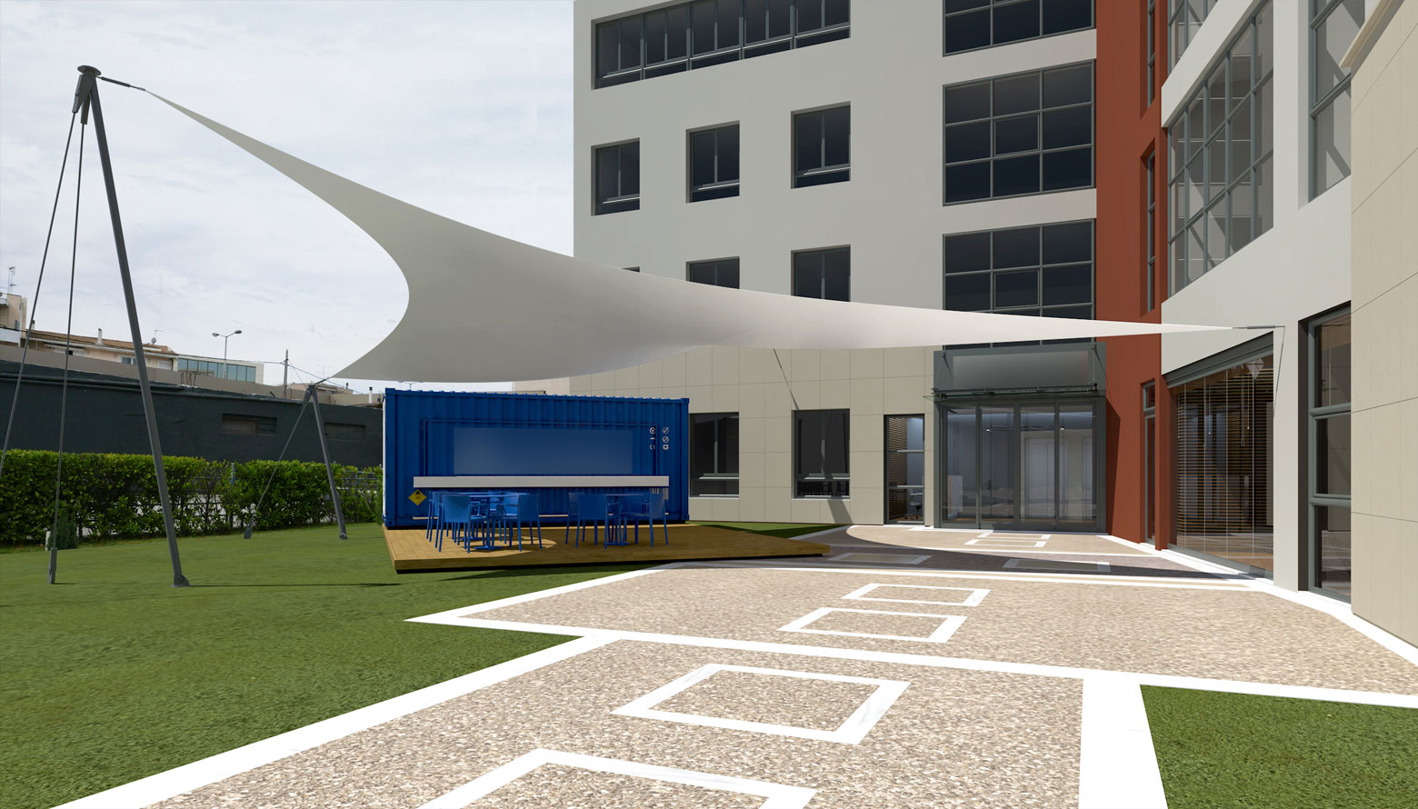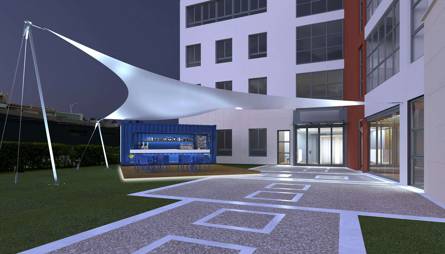 Mας ζητήθηκε η πρότασή μας για τη μετατροπή ενός μεγάλου, ισόγειου χώρου στο κτίριο γραφείων μεγάλης κατασκευαστικής εταιρείας, σε μια πολυλειτουργική αίθουσα για συναντήσεις, παρουσιάσεις και εκπαίδευση. Zητήθηκε επίσης να συνδέσουμε τη νέα αίθουσα με το εξωτερικό περιβάλλον και να διαμορφώσουμε τον υπαίθριο χώρο αντιστοίχως. Προτείναμε μια τέντα από προεντεταμένη μεμβράνη για προστασία του υπαίθριου χώρου, και ένα container που θα λειτουργούσε σαν μίνι καντίνα για διαλείμματα και ειδικά events.