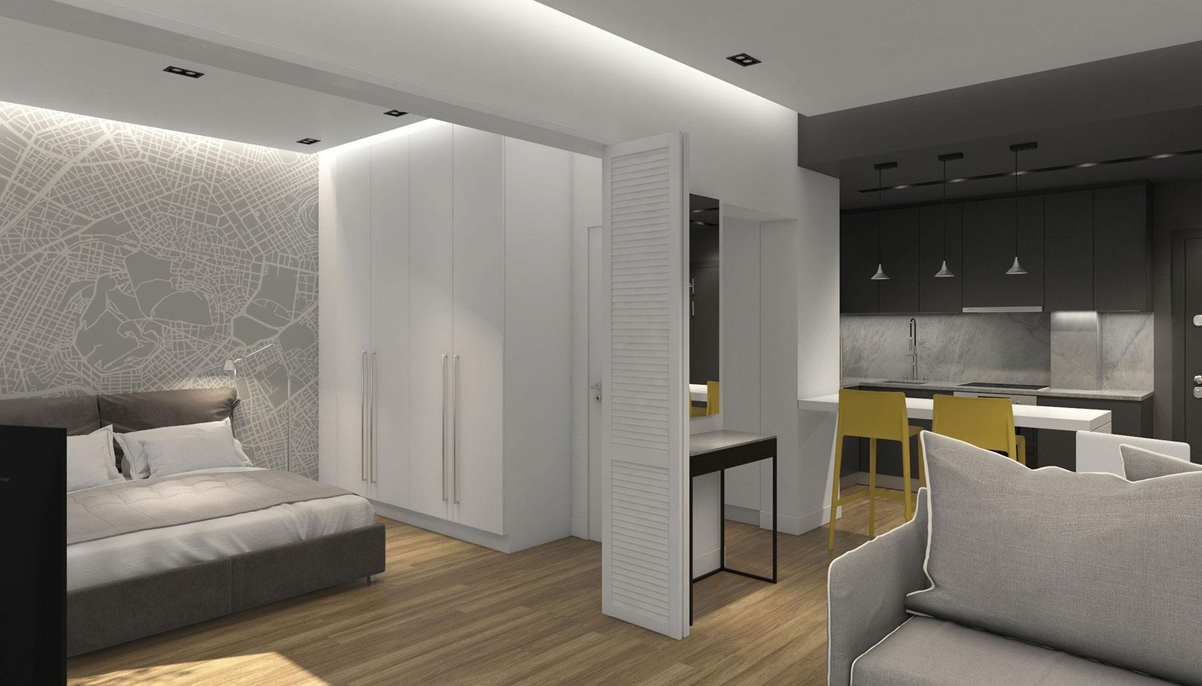 Ο ιδιοκτήτητης αυτού του μικρού Αθηναϊκού διαμερίσματος, εργολάβος-κατασκευαστής και ταυτόχρονα καλος μας φίλος, μας ανέθεσε να το μετασκευάσουμε σε ξενώνα Airbnb. Δουλέψαμε για αυτό το το έργο παράλληλα με τη μετασκευή ενός μεγαλύτερου διαμερίσματος στην ίδια περιοχή για τον ίδιο ιδιοκτήτη. Και για τα δύο διαμερίσματα η διαδικασία λήψης αποφάσεων ήταν τάχιστη και πολύ ομαλή, καθώς ο ιδιοκτήτης είχε παράλληλα και ρόλο κατασκευαστή.