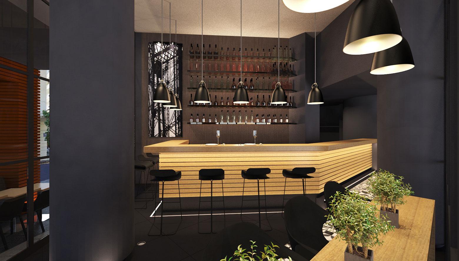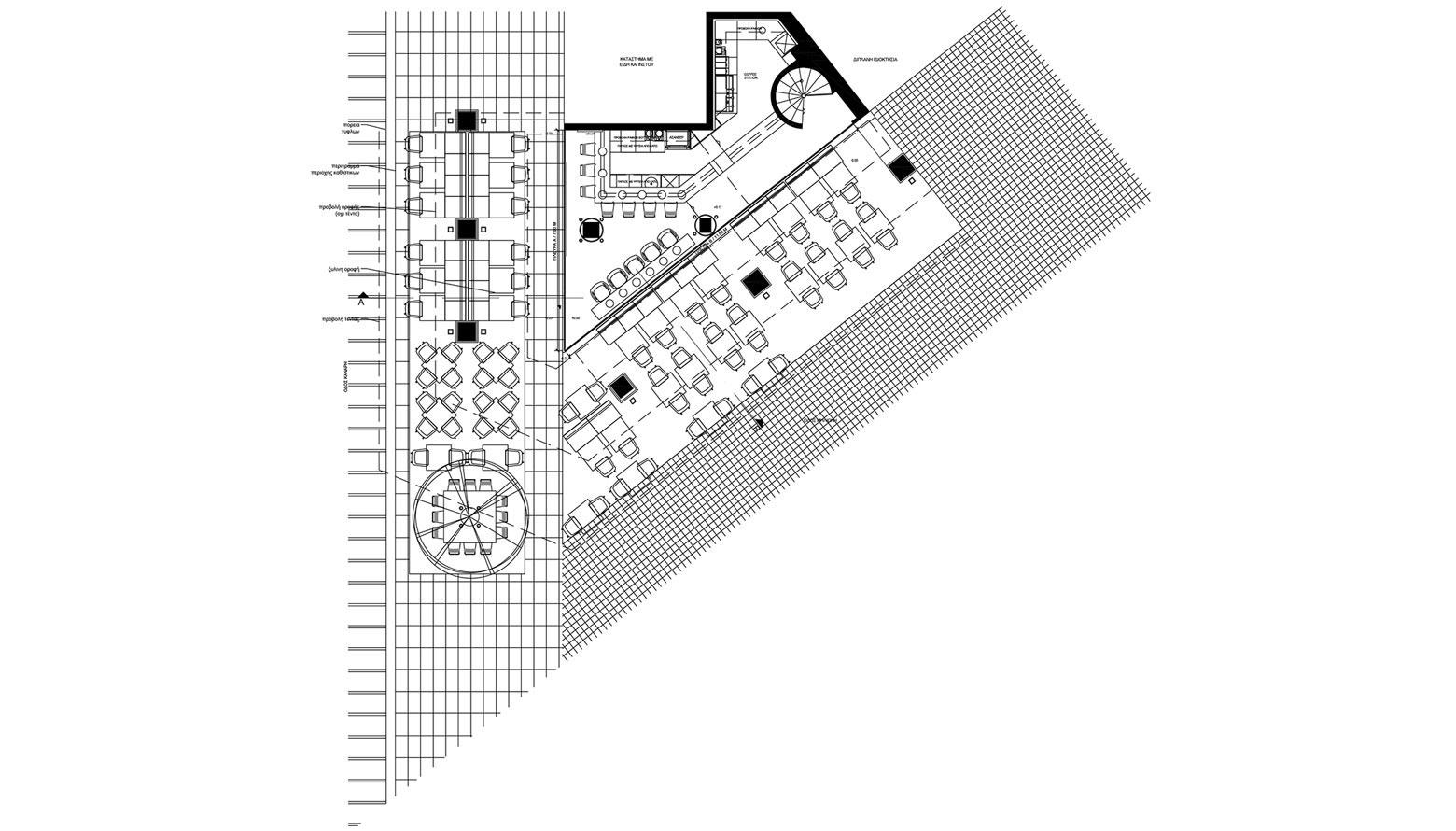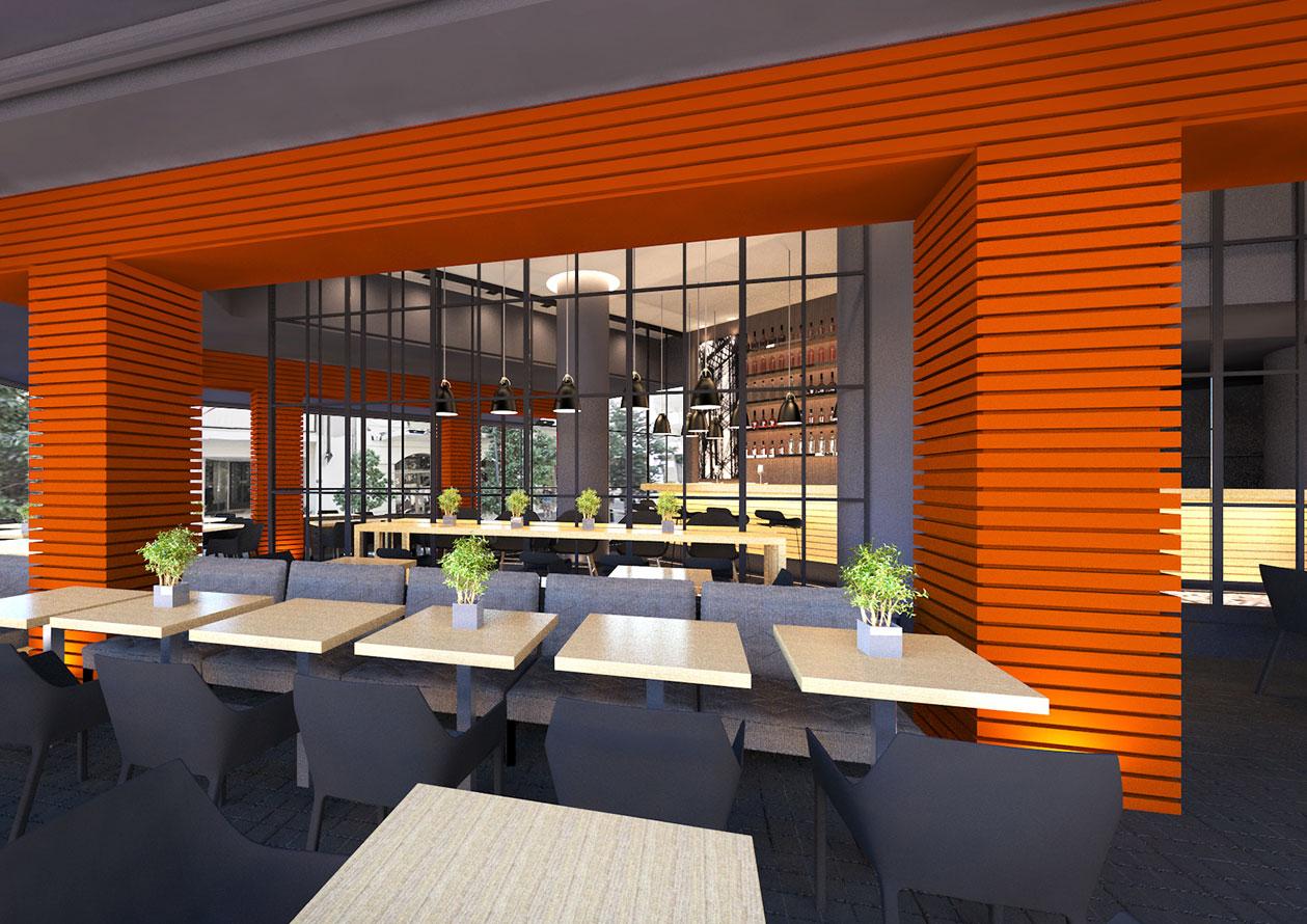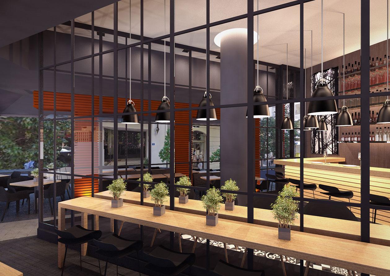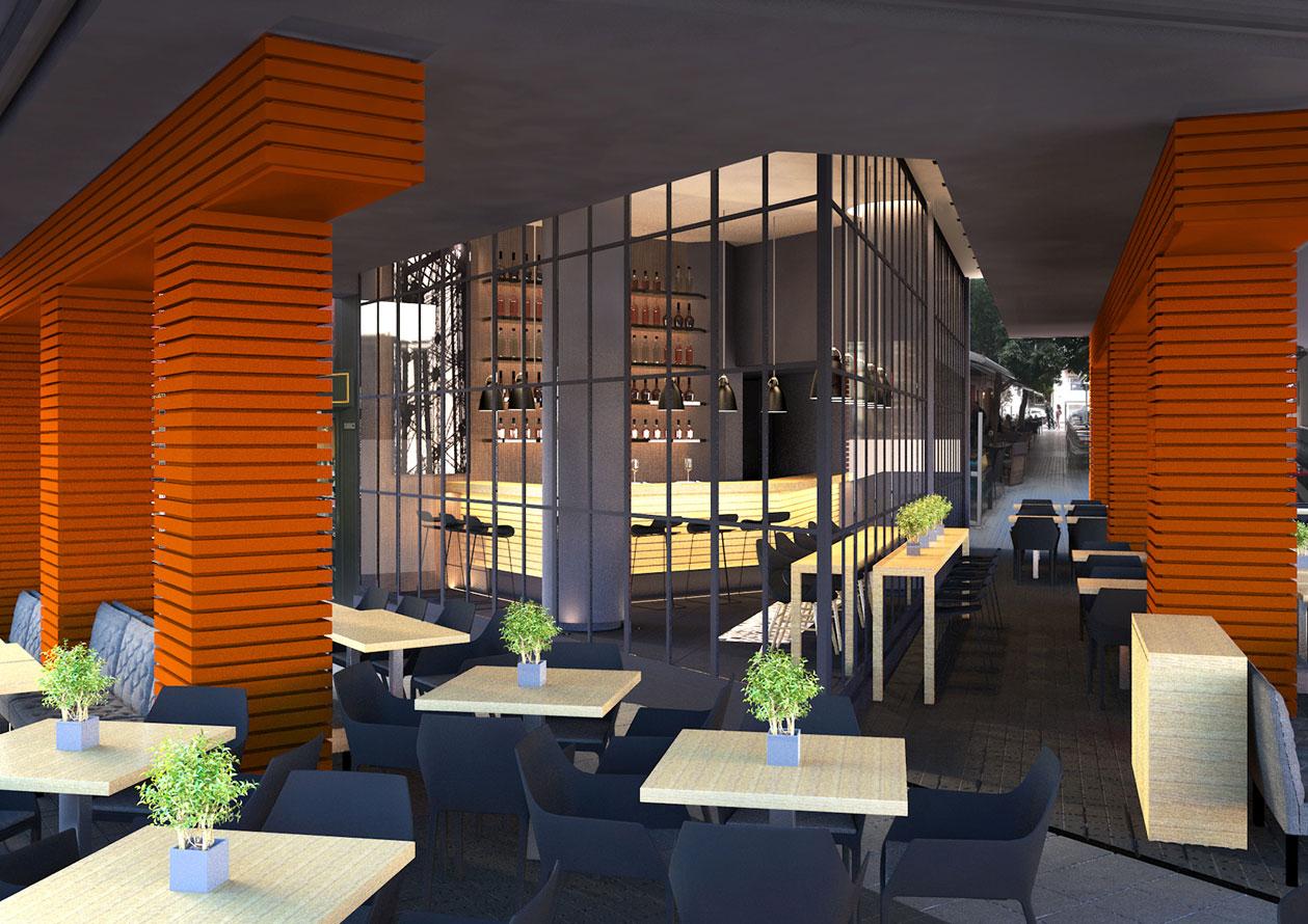 Το καλοκαίρι του 2015, ανακαινίσαμε ένα λιλιπούτειο cafe/bar/εστιατόριο με τριγωνική κάτοψη, στη γωνία των οδών Κανάρη και Μηλιώνη στο Κολωνάκι. Δεδομένου ότι ήταν ήδη δημοφιλές στέκι επωνύμων, έπρεπε με την ανακαίνιση να καλυφθούν τόσο οι υψηλές απαιτήσεις του ιδιοκτήτη, όσο και οι προσδοκίες των φίλων και πελατών του. Ένα από τα κύρια στοιχεία της επέμβασης, είναι η επένδυση των κολονών και των δοκών της όψης με πορτοκαλί αλουμινένιες δοκίδες, με στόχο να ξεχωρίσει το μικροσκοπικό κατάστημα από τις πολλές γειτονικές του επιχειρήσεις.