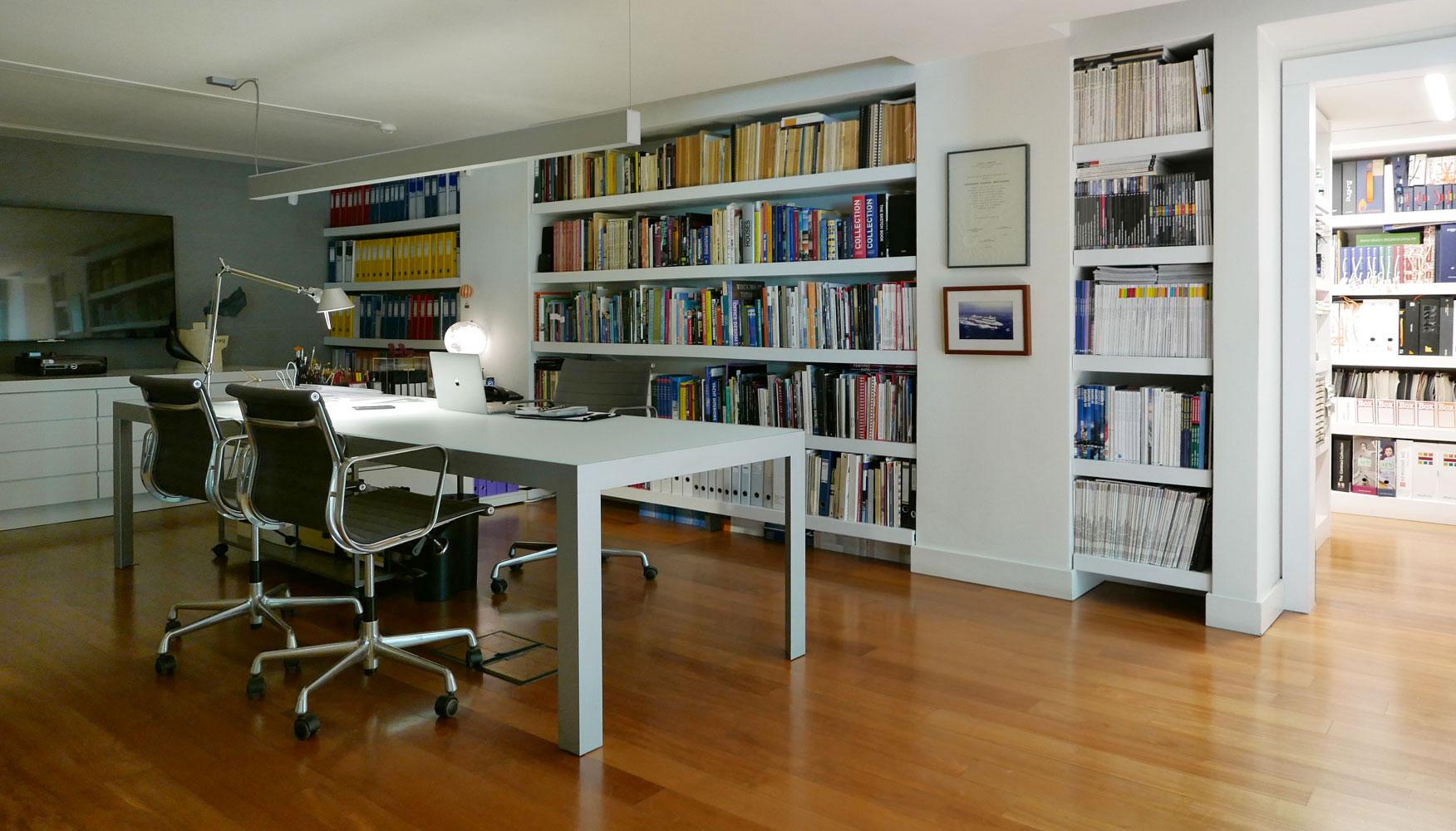 To 2007, έχοντας τη δεκαετή εμπειρία του πρώτου μας γραφείου και γνωρίζοντας επακριβώς τις ανάγκες και τα θέλω μας, σχεδιάσαμε τα νέα μας γραφεία, όπως ακριβώς τα φανταζόμασταν. Το κτίριο βρίσκεται στο κέντρο ενός μεγάλου κήπου, του οποίου την εικόνα απολαμβάνουμε καθημερινά μέσα από τεράστια γυάλινα ανοίγματα. Το γραφείο είναι εξοπλισμένο με ένα εκτεταμένο σύστημα ραφιών, όπου βρίσκονται απόλυτα αρχειοθετημένα τα δείγματα υλικών, τα εργαλεία μας, τα βιβλία και οι κατάλογοι μας. Η ψυχή του γραφείου μας, όμως, είναι οι μεγάλες νησίδες εργασίας και δημιουργικότητας που βρίσκονται στο κέντρο του.