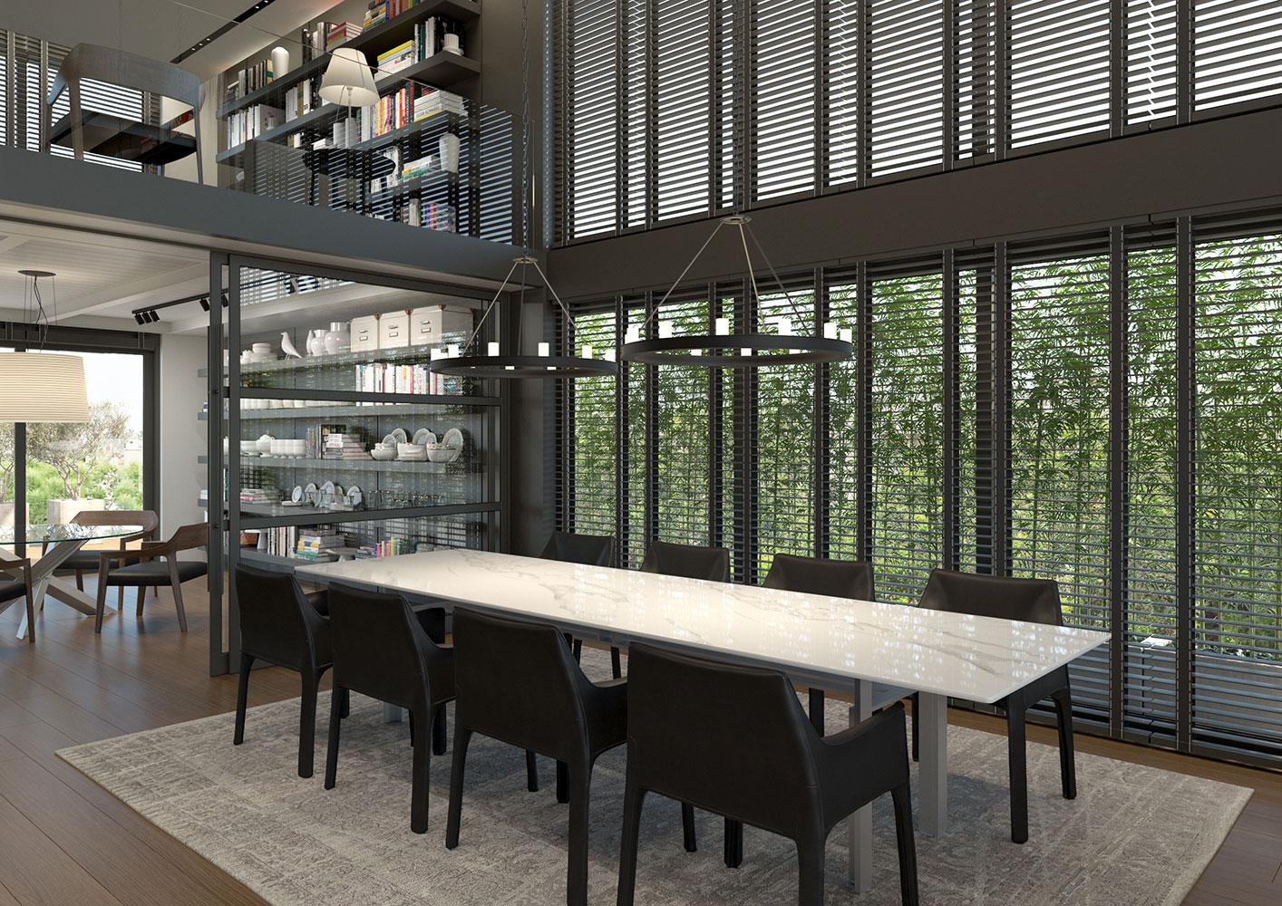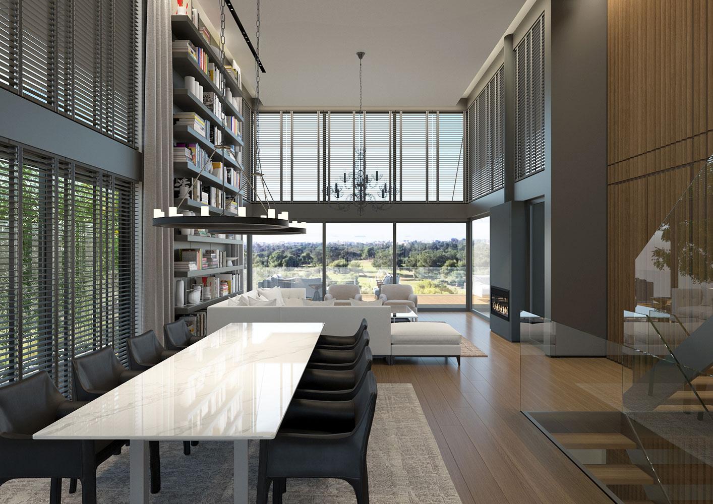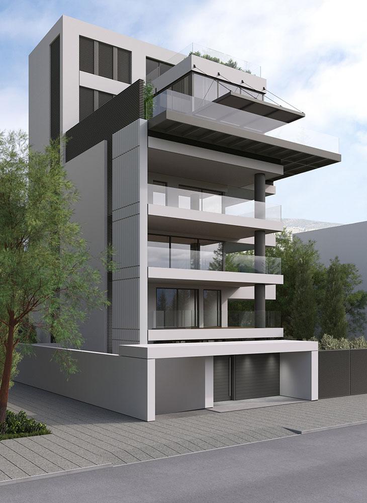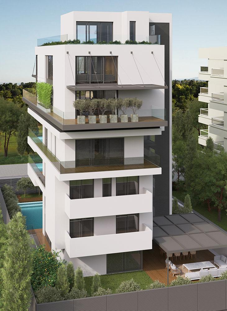 Το κτίριο που σχεδιάσαμε αποτελείται από μια ισόγεια μεζονέτα, ένα οροφοδιαμέρισμα και τη μεζονέτα της ιδιοκτήτριας, με μοναδική θέα στο Golf της Γλυφάδας και τη θάλασσα.