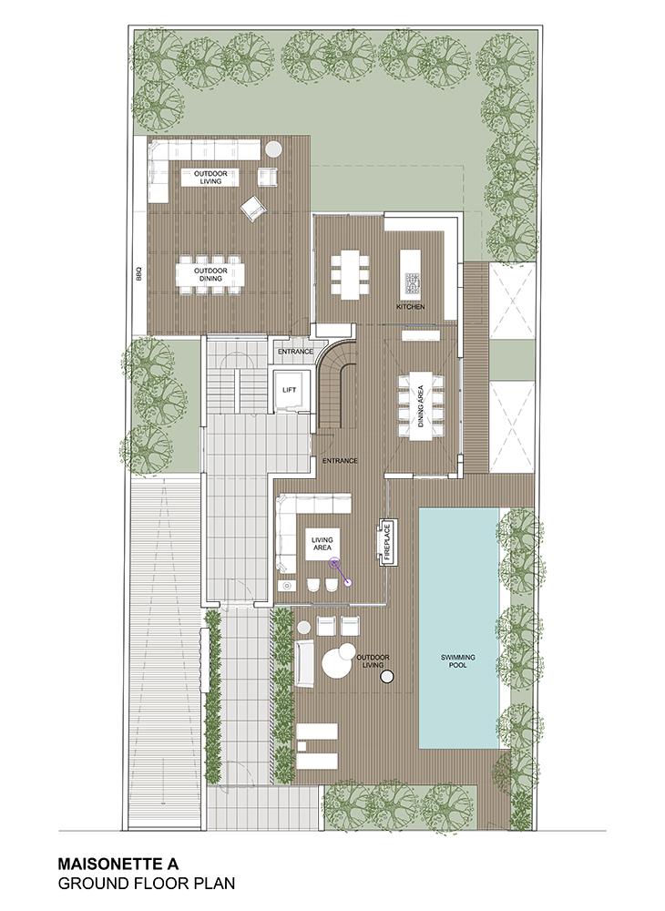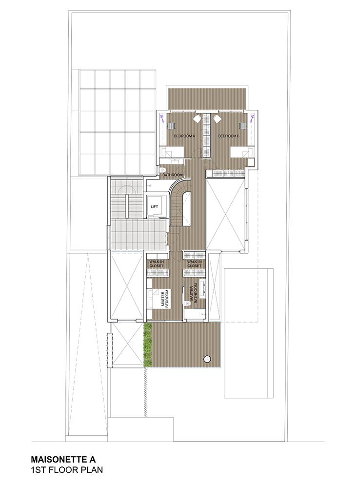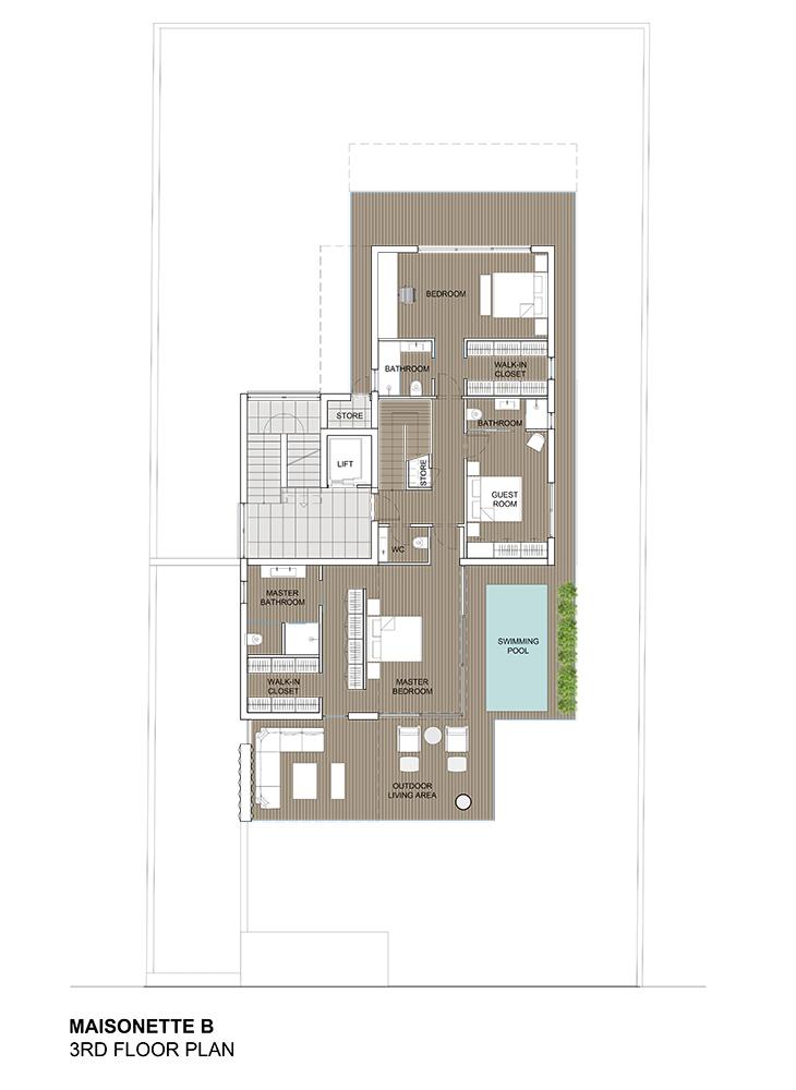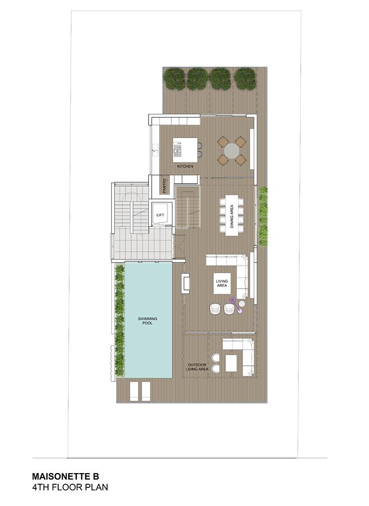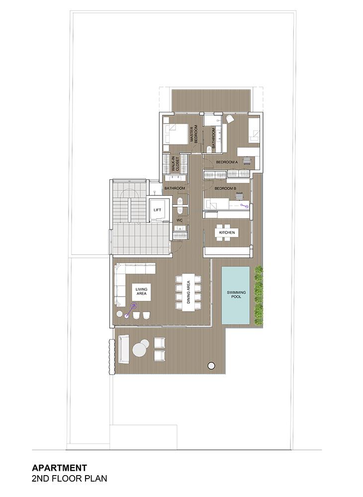 Η ιδιοκτήτρια του οικοπέδου μας ζήτησε να σχεδιάσουμε ένα κτίριο κατοικιών, τους τελευταίους ορόφους του οποίου θα καταλάμβανε μια μεζονέτα με πισίνα για δική της χρήση.