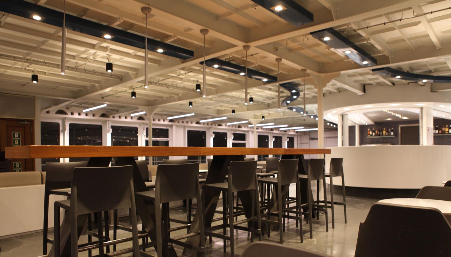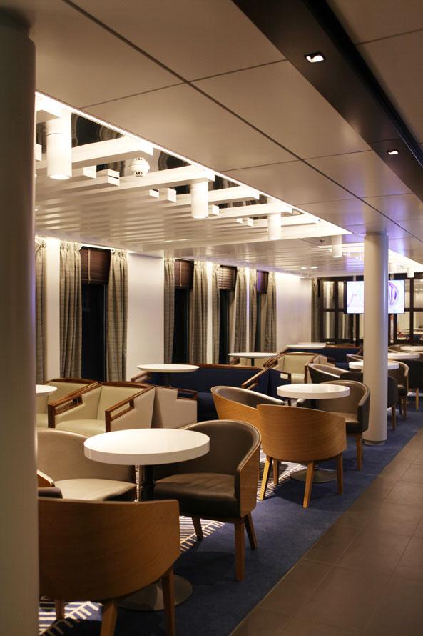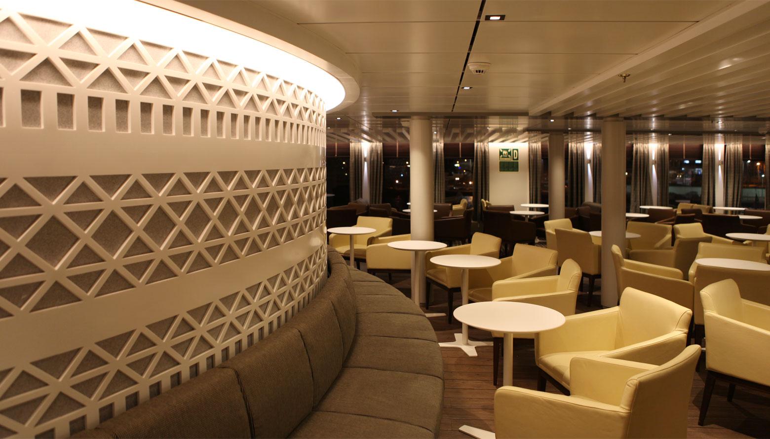Η ιδέα ήταν να σχεδιάσουμε ένα πλοίο με έντονη την παρουσία των νησιών που επισκέπτεται. Έτσι σχεδιάσαμε το Mykonos Lounge κάτω από μια μεγάλη “ψάθινη” οροφή, ανάμεσα σε “μπουκαμβίλιες’ και “ανεμόμυλους”, το Tinos Lounge με τους χαρακτηριστικούς “περιστεριώνες” και αναφορά στην μαρμαρογλυπτική τέχνη και φυσικά το Andros Lounge, γενέτειρα των πελατών μας, με τα αντίστοιχα μοτίβα του νησιού.