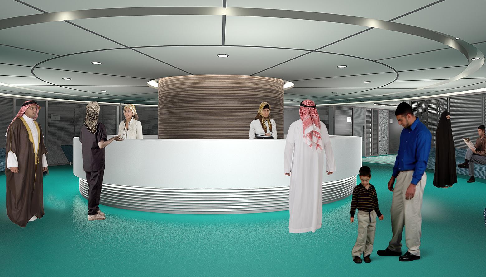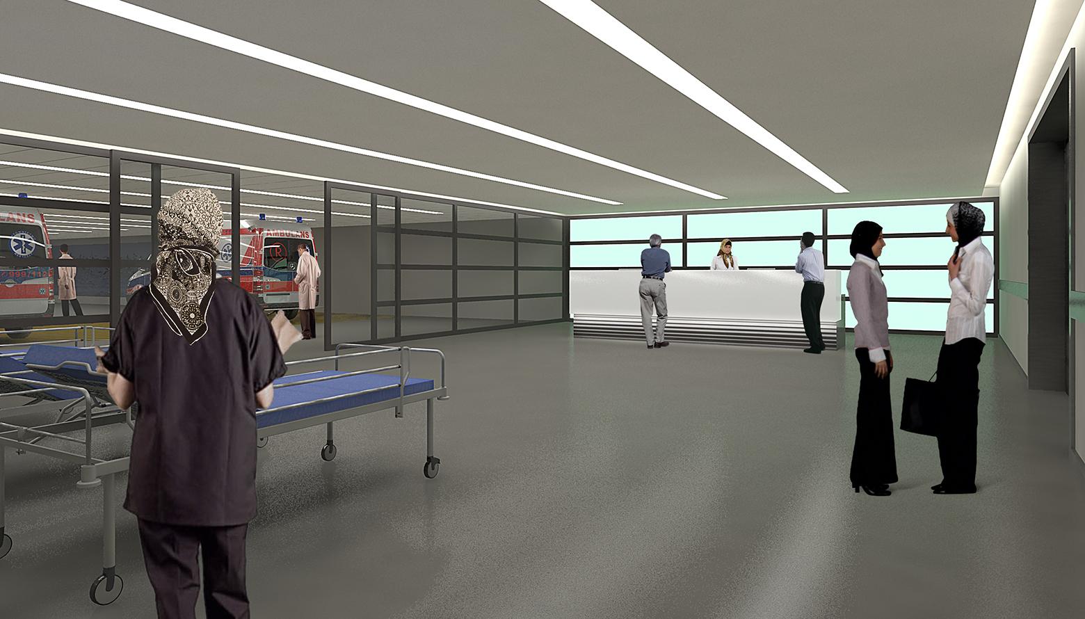 Ακολουθώντας το πολύ αυστηρό κτιριολογικό πρόγραμμα, σχεδιάσαμε κλινικές, χειρουργεία, θαλάμους ασθενών, καθώς και κοινόχρηστους χώρους, κλιμακοστάσια, και μια διπλή, παράλληλη είσοδο για επιβάτες και ασθενοφόρα.