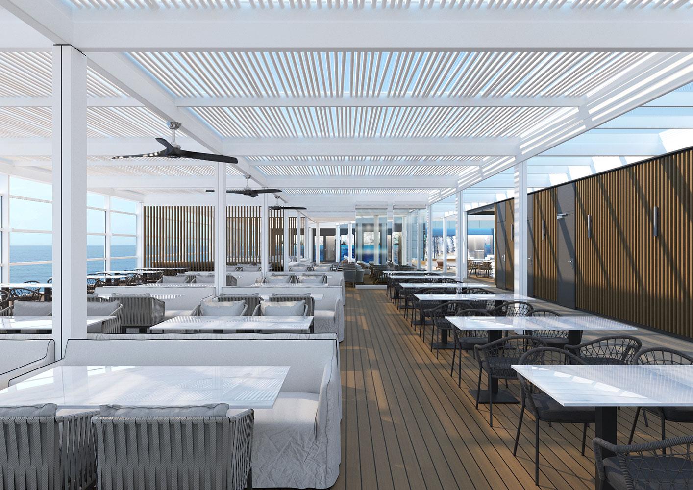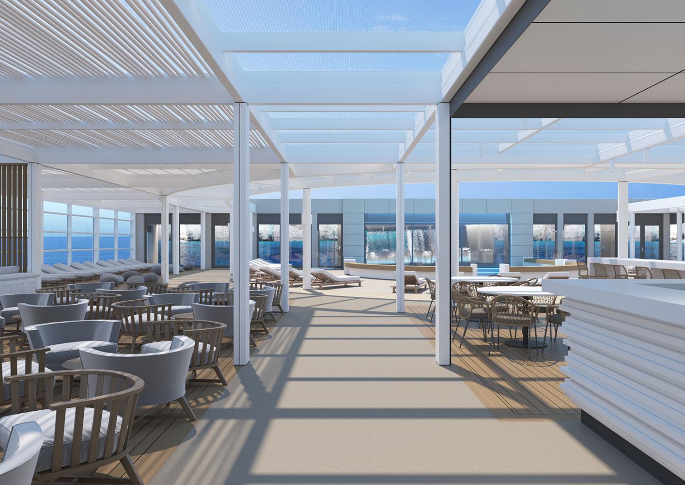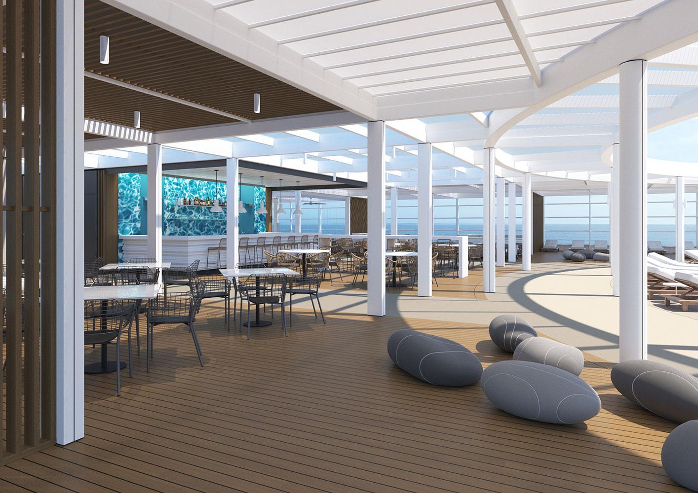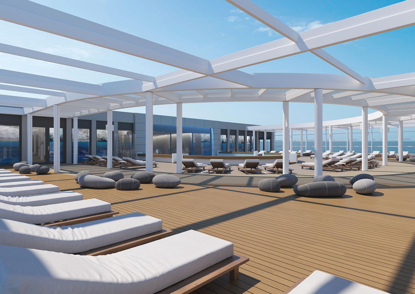 Σε αυτή τη νέα μας συνεργασία, η πλοιοκτήτρια εταιρία μας ανέθεσε τη διαμόρφωση του τελευταίου deck του ολοκαίνουργιου και πρωτοποριακού της πλοίου, με πολλούς υπαίθριους χώρους.